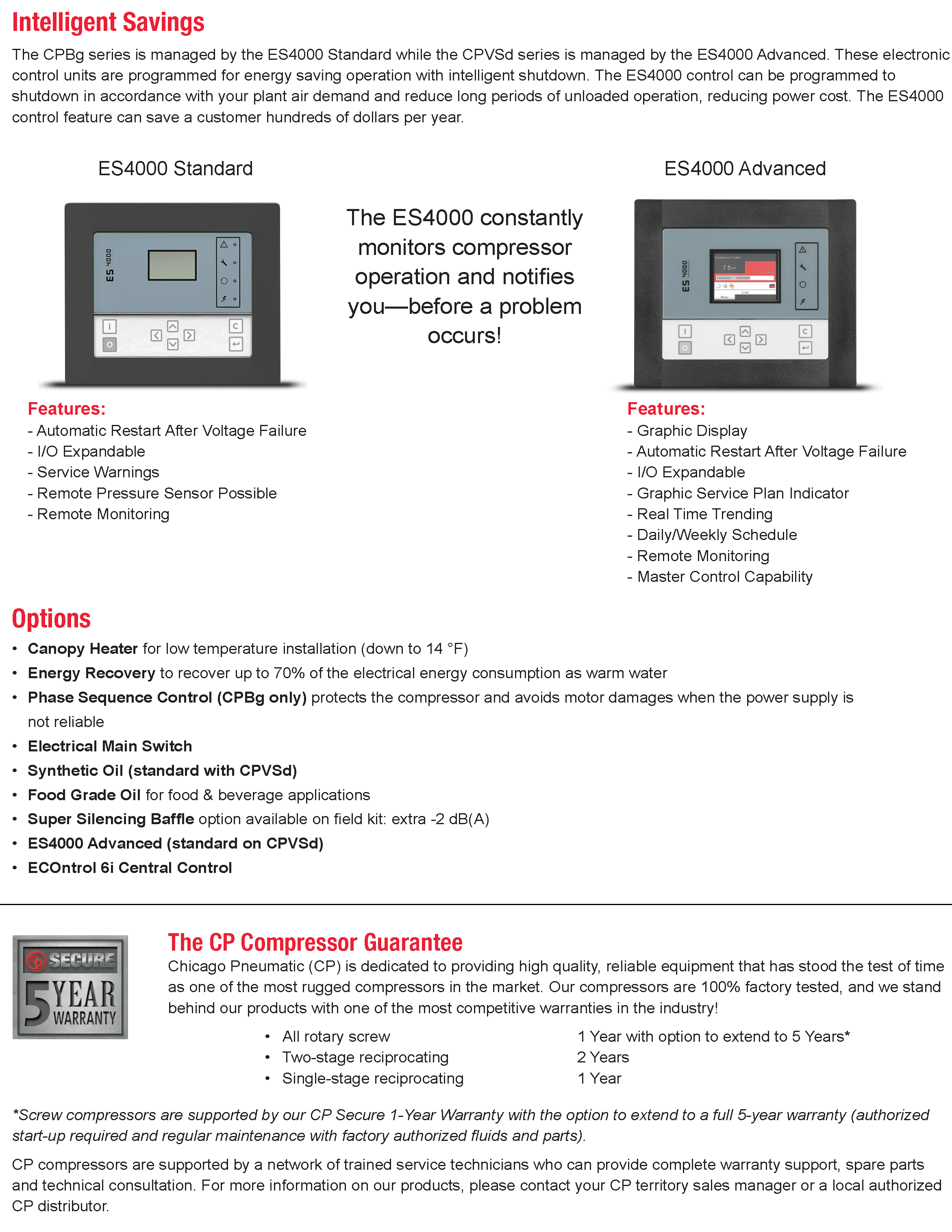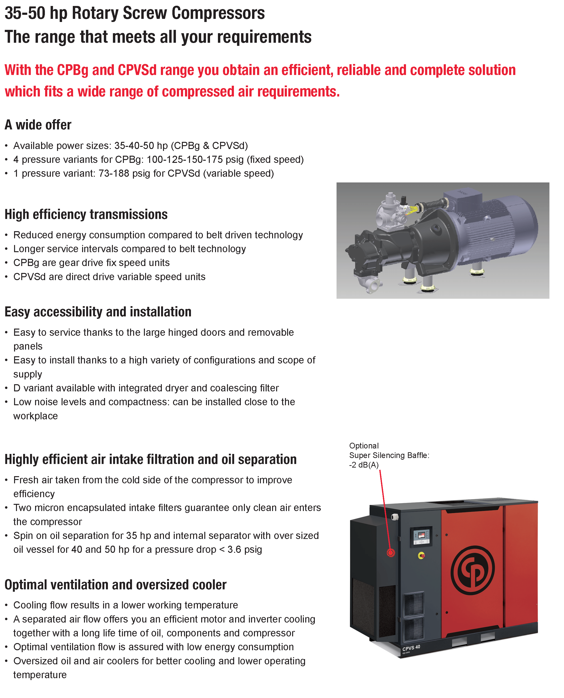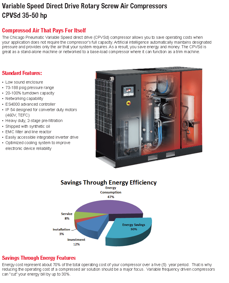 The Chicago Pneumatic Variable Speed (CPVS) compressor allows you to save operating costs when your application does not require the compressor’s full capacity.
