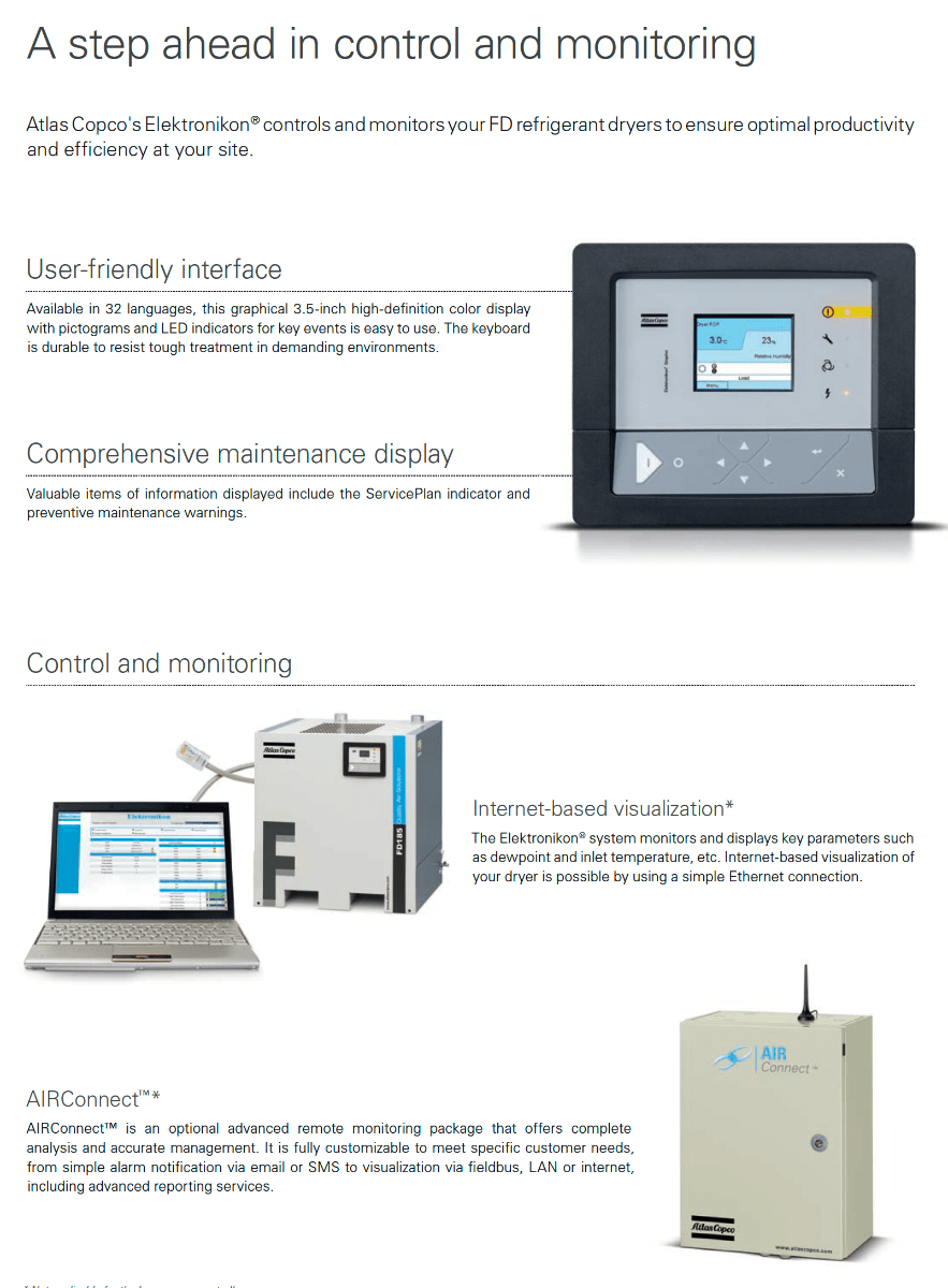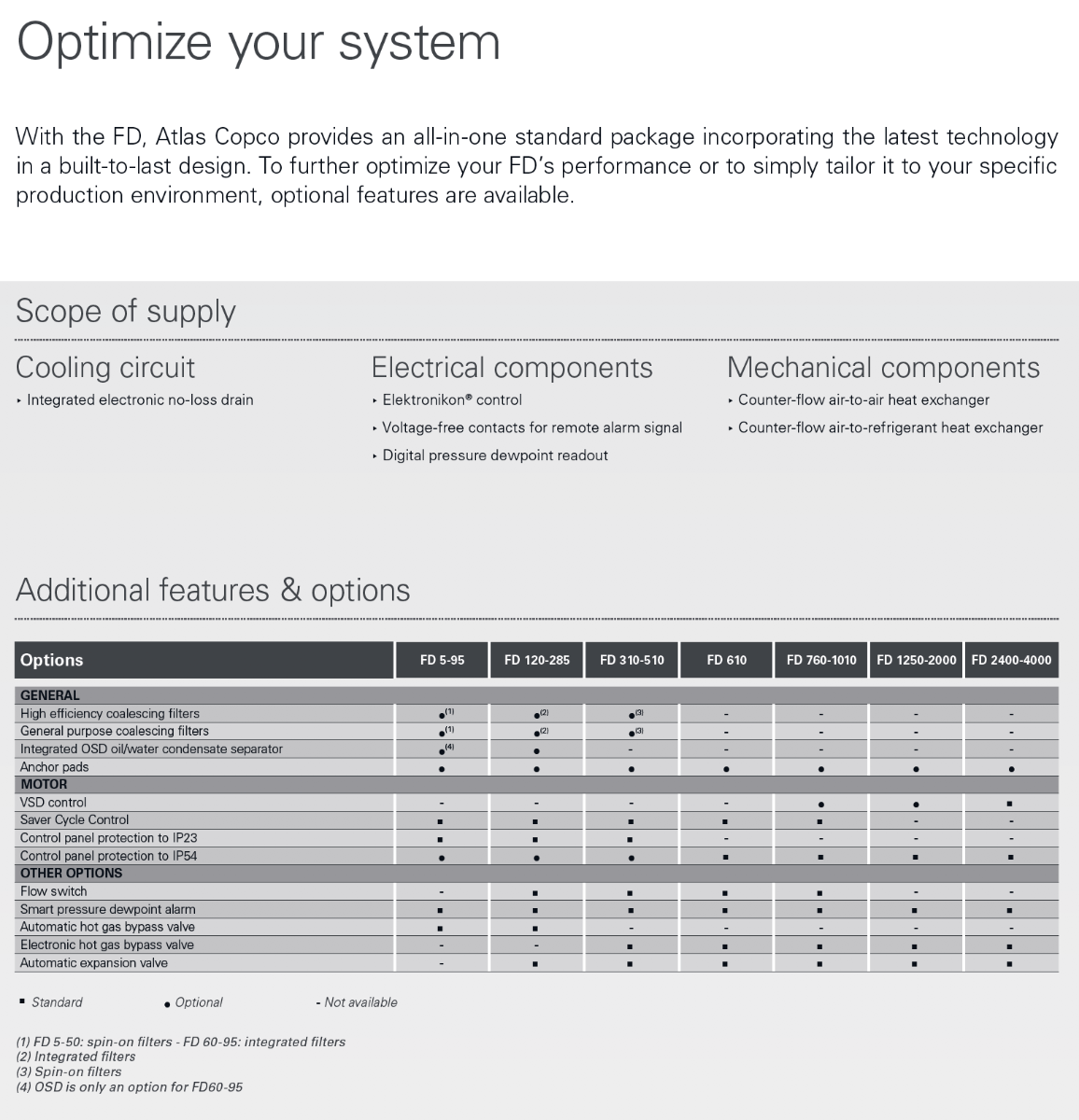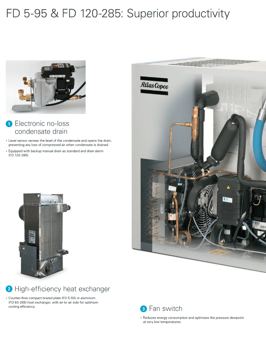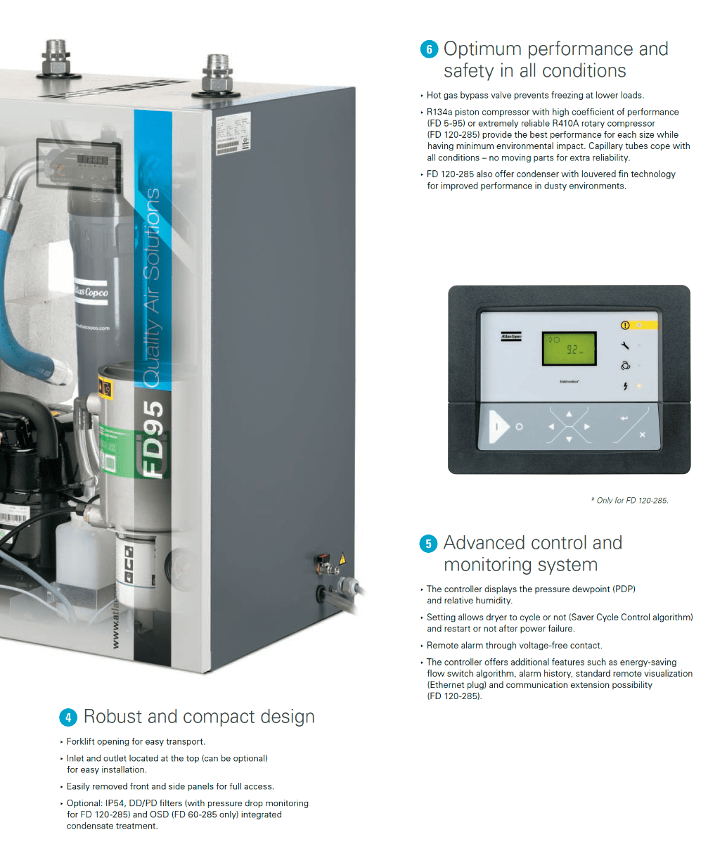 FD compressed air dryers incorporate advanced energy saving features and low pressure drops to reduce total power consumption.