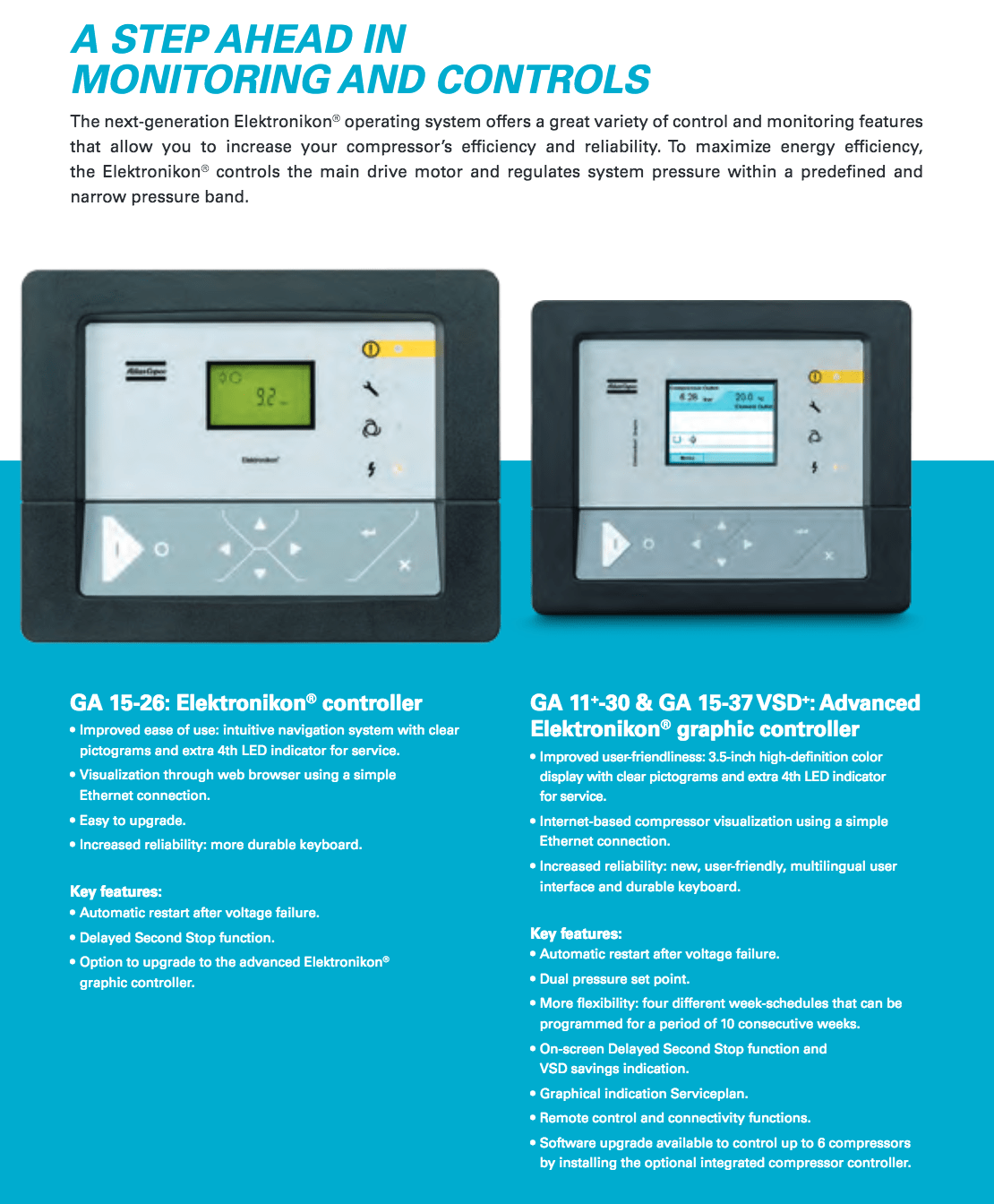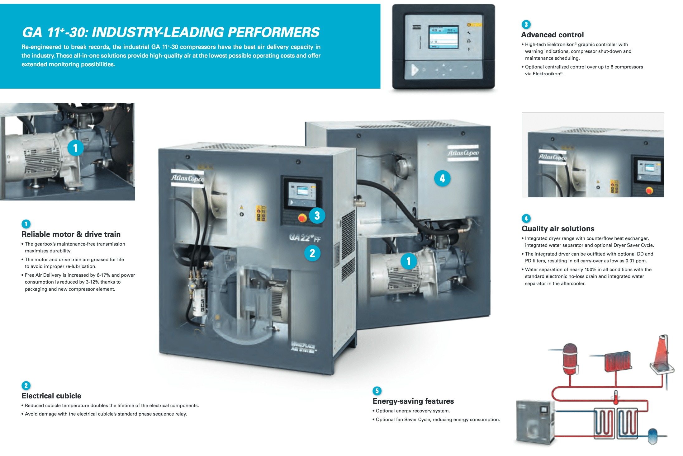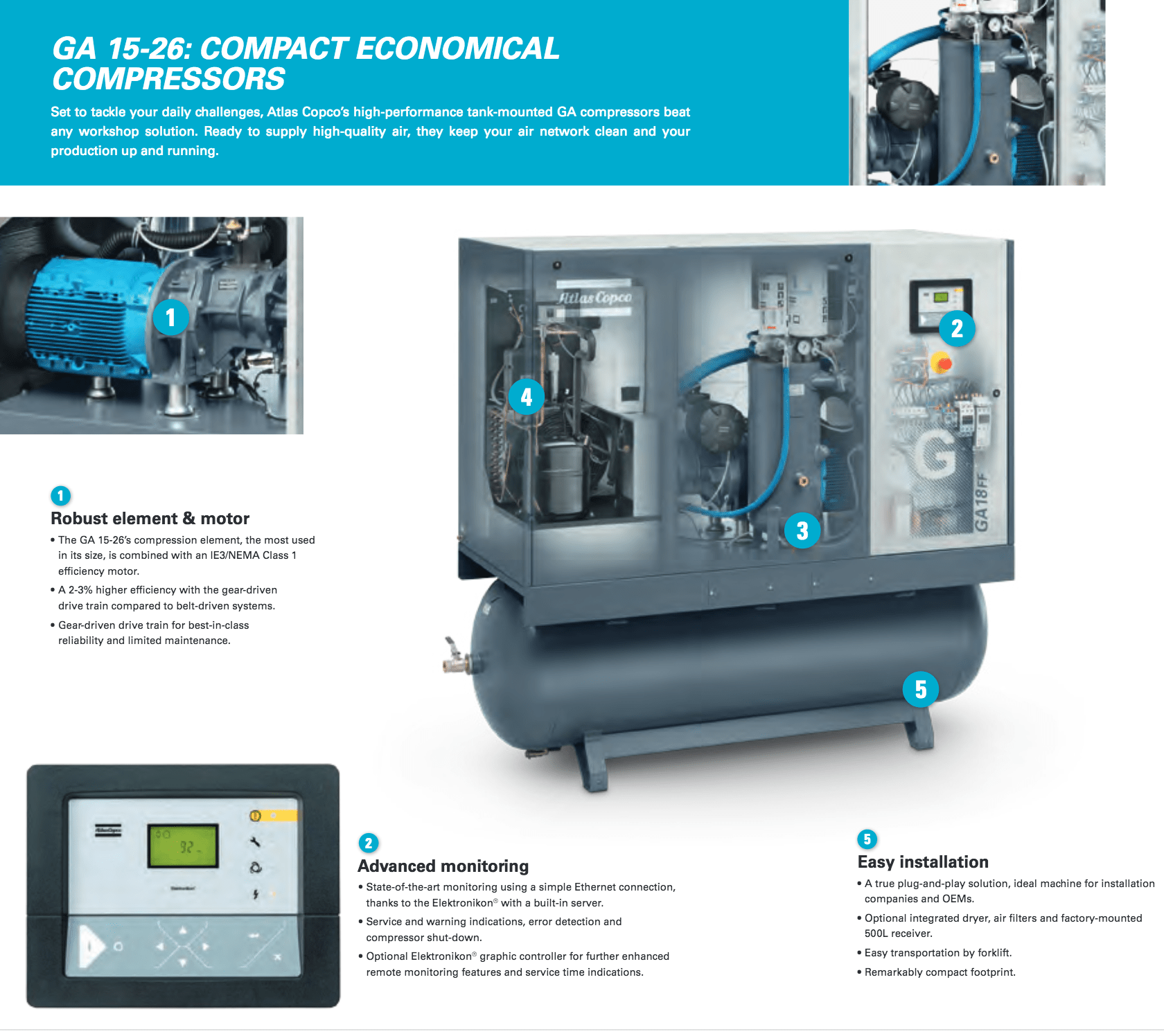 Atlas Copco GA Series 15-26- Single Stage, air-cooled and oil injected compressors. GA Series carries 20, 25, 30 & 35 Horsepower models which include drive motor, air and oil systems, Mark 5 Graphic and electrical regulating controls. These units are available to serve your needs in either a Pack or Full Feature.