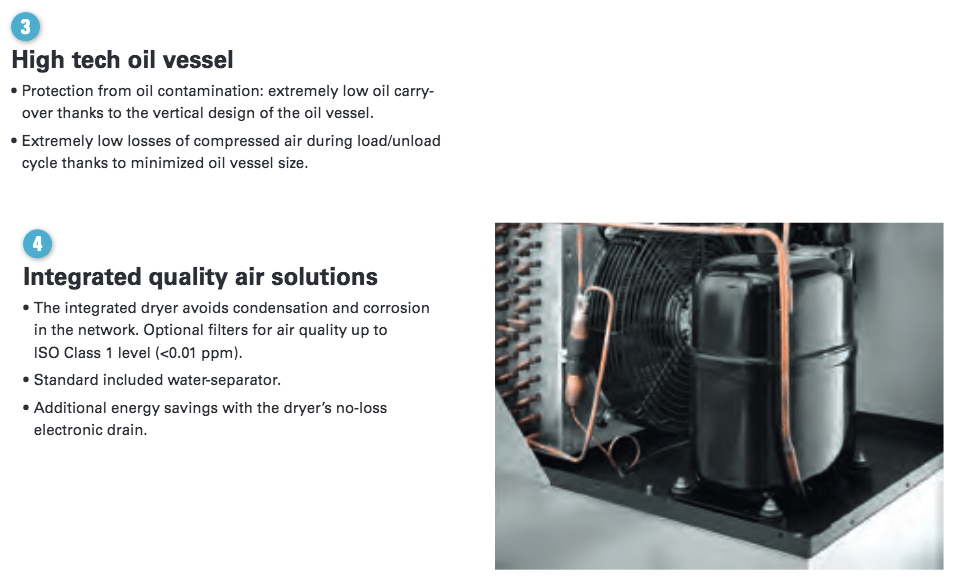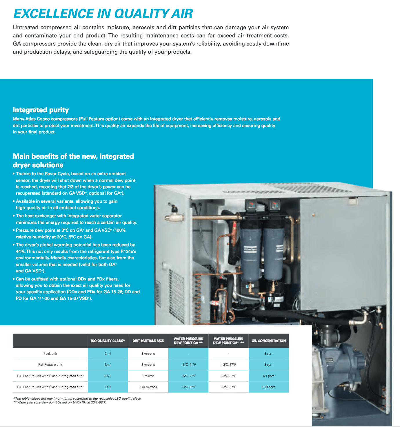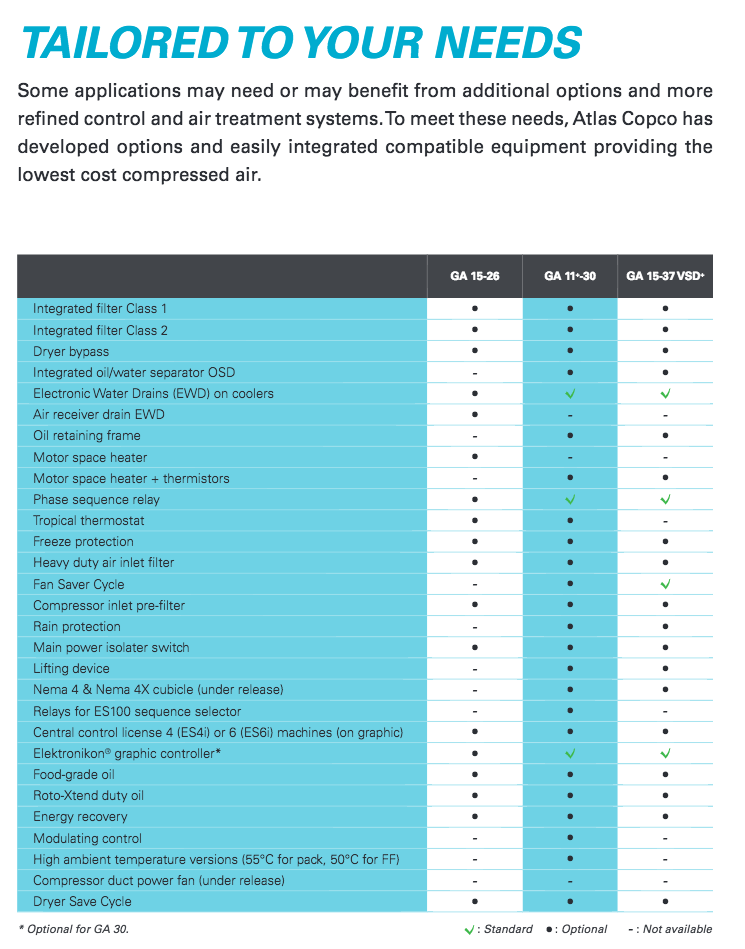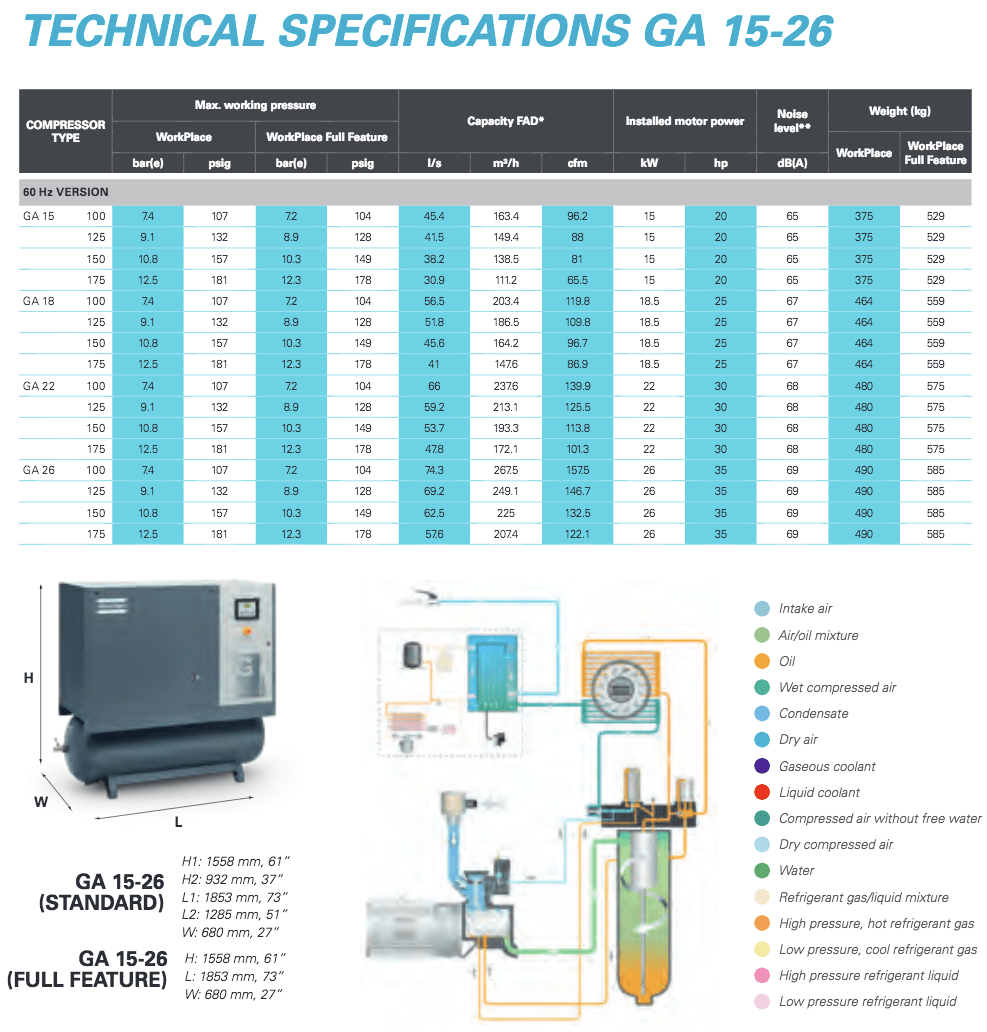Atlas Copco GA Series 15-26- Single Stage, air-cooled and oil injected compressors. GA Series carries 20, 25, 30 & 35 Horsepower models which include drive motor, air and oil systems, Mark 5 Graphic and electrical regulating controls. These units are available to serve your needs in either a Pack or Full Feature.