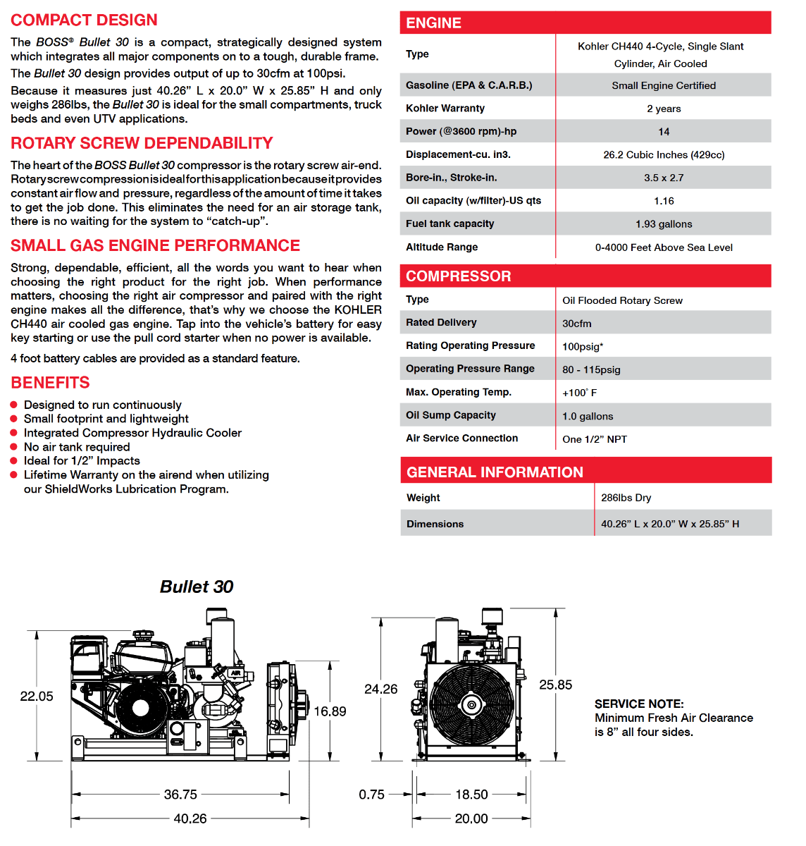 The Boss Bullet offers a high caliber performance from a high caliber machine. The Bullet is a fully self-contained, gas engine driven rotary screw Compressor World Latin America. It's capable of producing 30 CFM and 100 PSI continuously, with plenty of reserve.