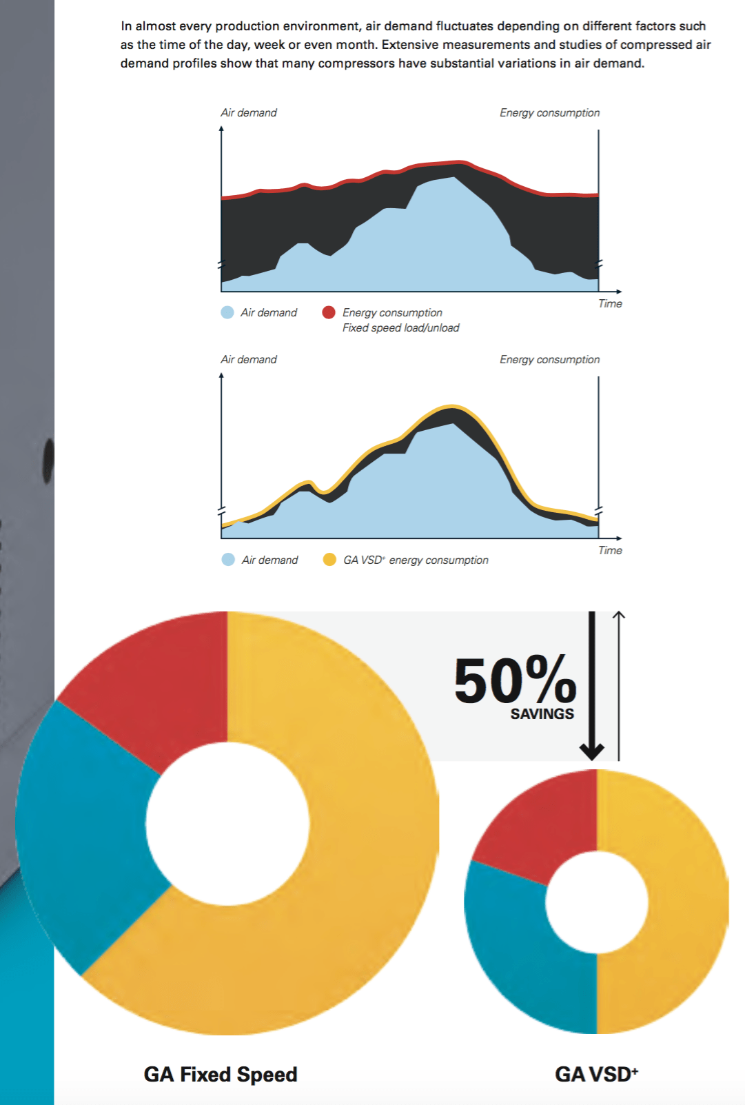 - Exceptional energy savings – Atlas Copco’s GA Variable Speed Drive+ (VSD+) technology closely follows the air demand by automatically adjusting the motor speed to match the compressed air supply to the air demand. Combined with the innovative design of the iPM (Permanent Magnet) motor (efficiency corresponding to IE4 efficiency), this results in average energy savings of 50% and an average cut of 37% in the lifecycle cost of a compressor. A new, more efficient fan motor achieves another saving on specific energy requirements of up to 7% of the compressor power.