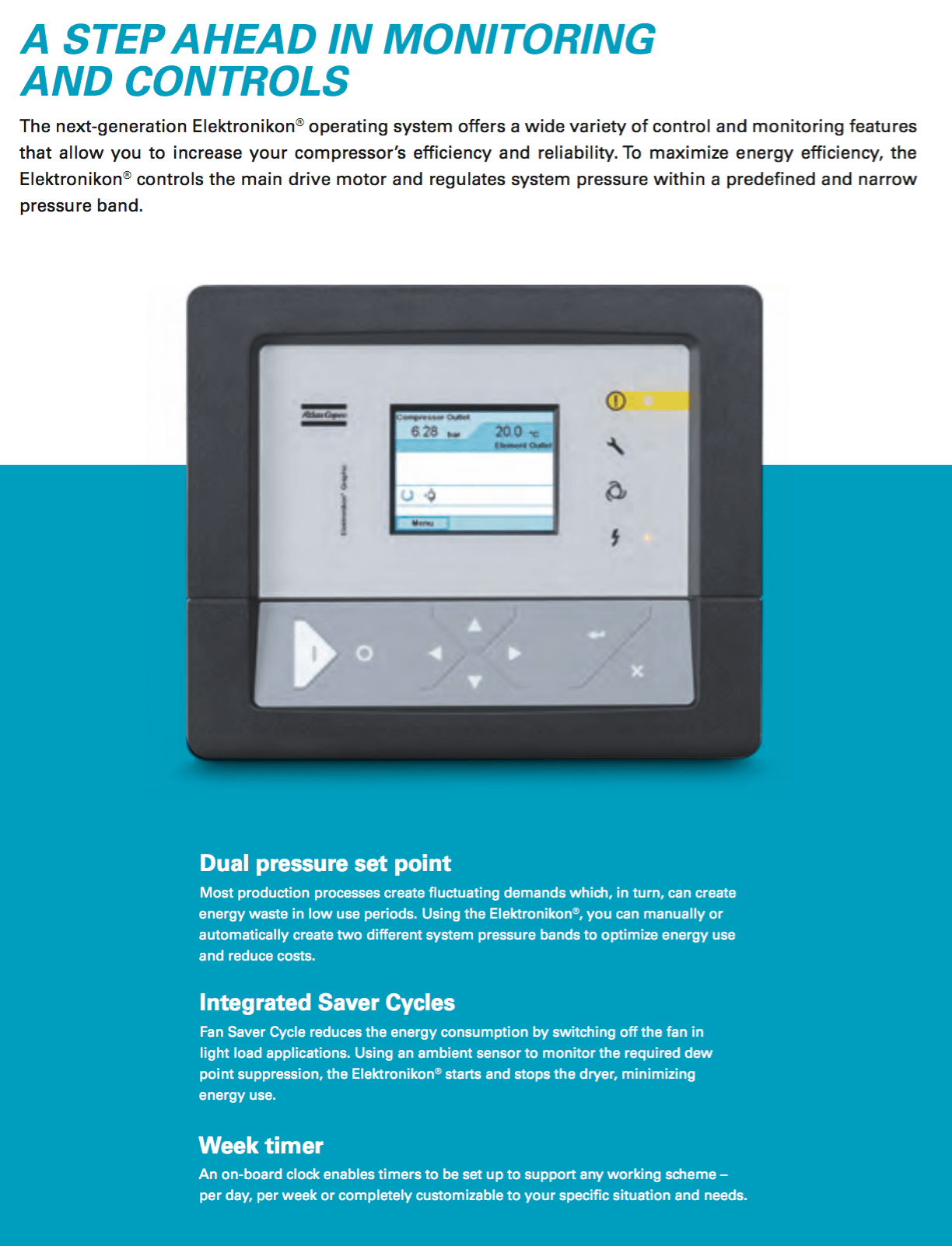 - Advanced control and monitoring – To maximize efficiency and reliability, the Elektronikon® controls the main drive motor and regulates system pressure within a predefined and narrow pressure band. The Elektronikon® controller can be adapted to your specific needs with extra sensors, digital contacts, fieldbus, Internet and SMS communication functions. In combination with the ES multiple compressor controller, the operation of your complete compressor room is optimized.