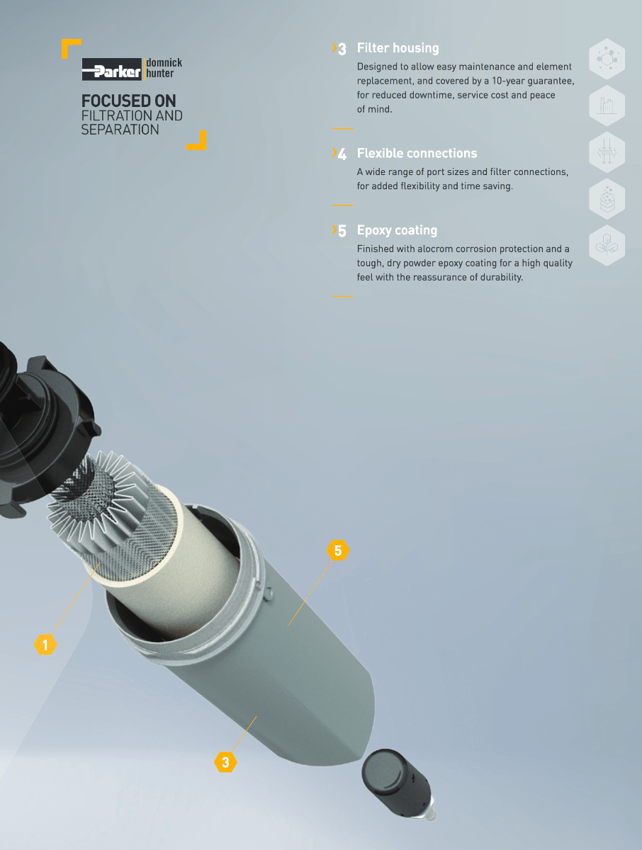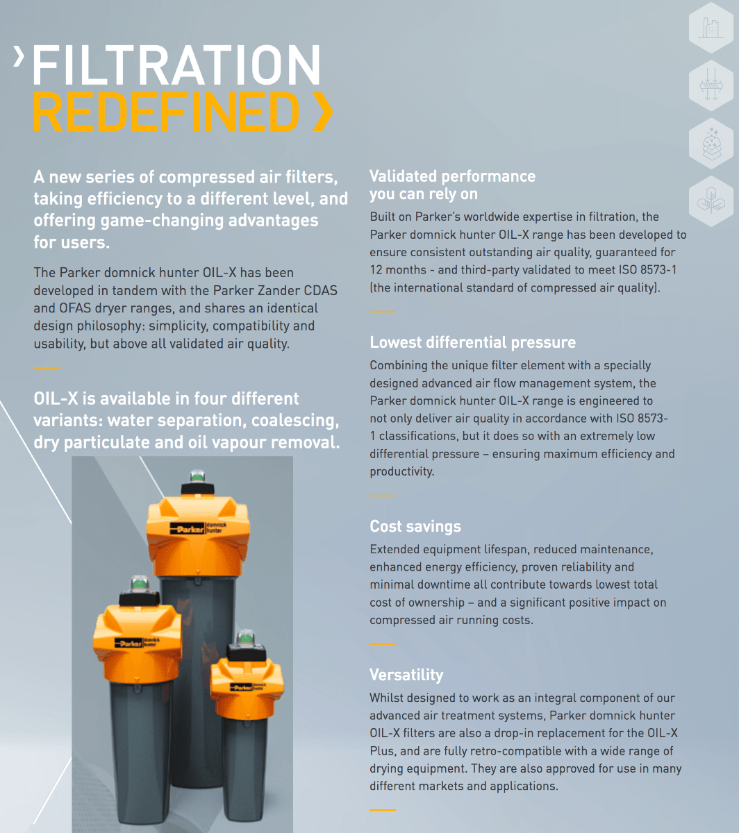Parker domnick hunter OIL-X EVOLUTION is a range of high efficiency compressed air filters consisting of coalescing filter grades for the removal of water and oil aerosols, solid particulates and micro-organisms and dust filter grades for the removal of dry particulate and micro-organisms.