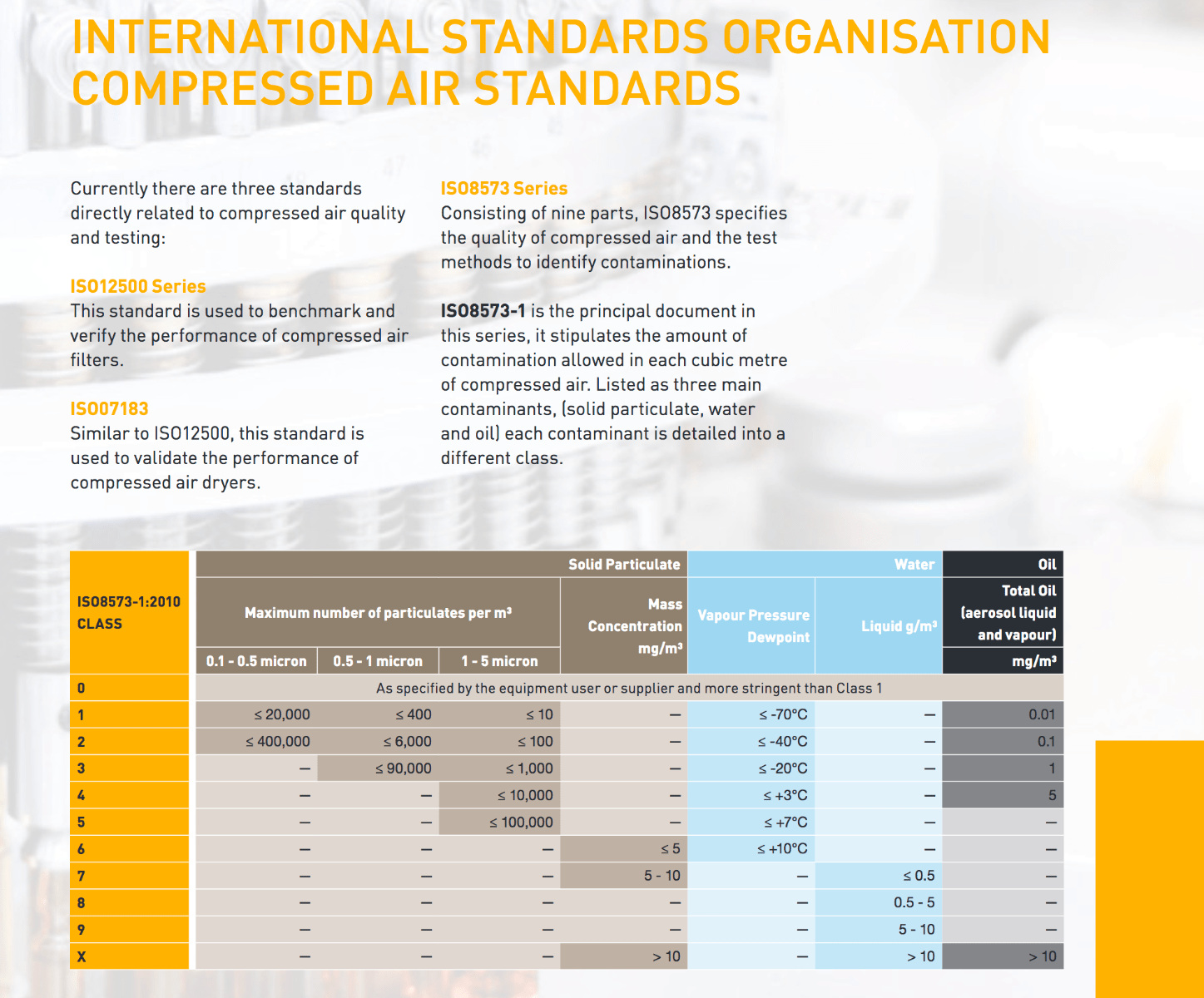 - Delivered air quality in accordance with ISO 8573-1:2001, the international standard for