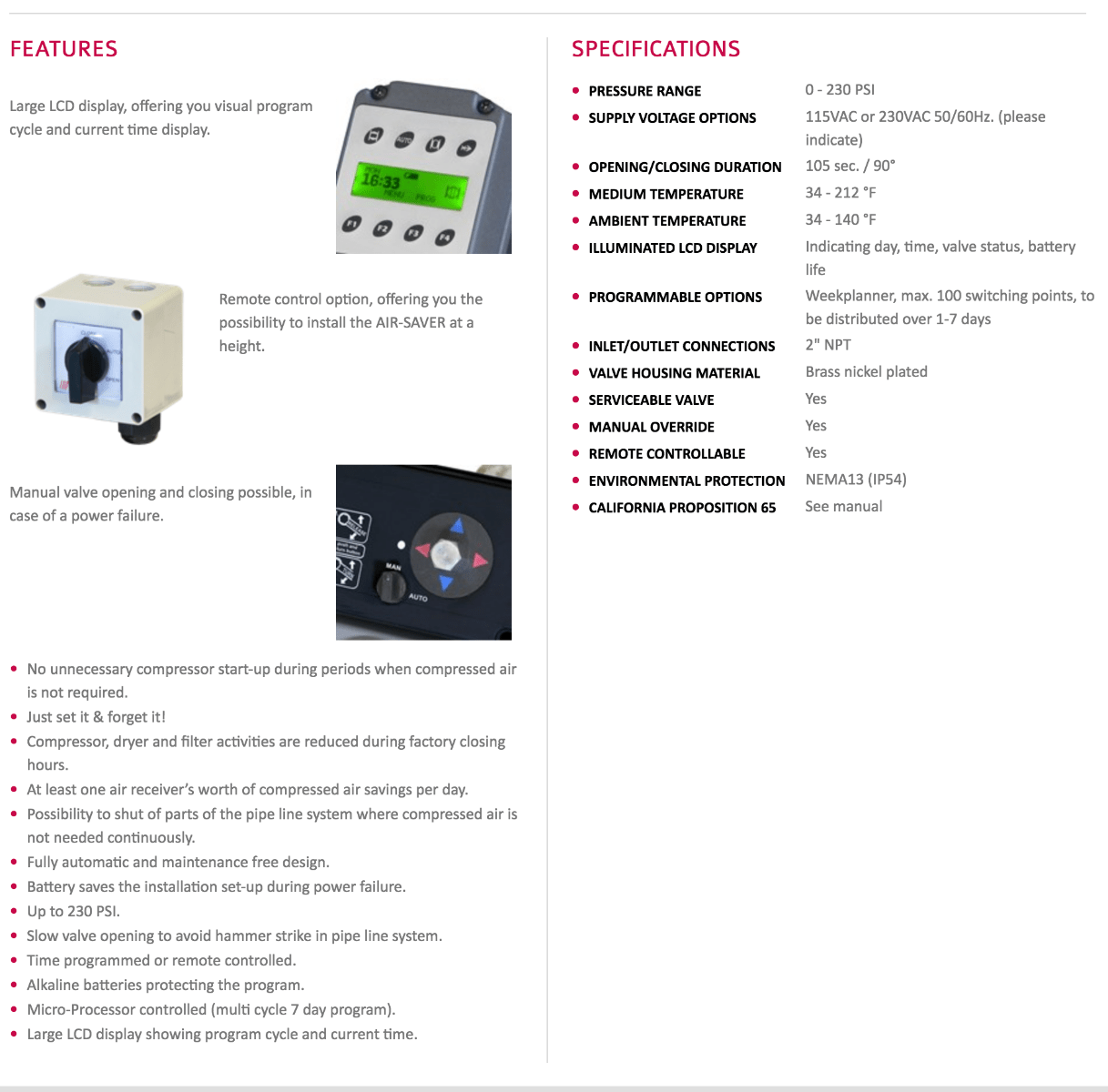 The AIR-SAVER is a simple timed valve that isolates your compressor and compressed air storage tank from the rest of your compressed air system. Using a programmable timer, it opens just before each shift starts and closes just after each shift ends, ensuring you never lose valuable compressed air to leaks.