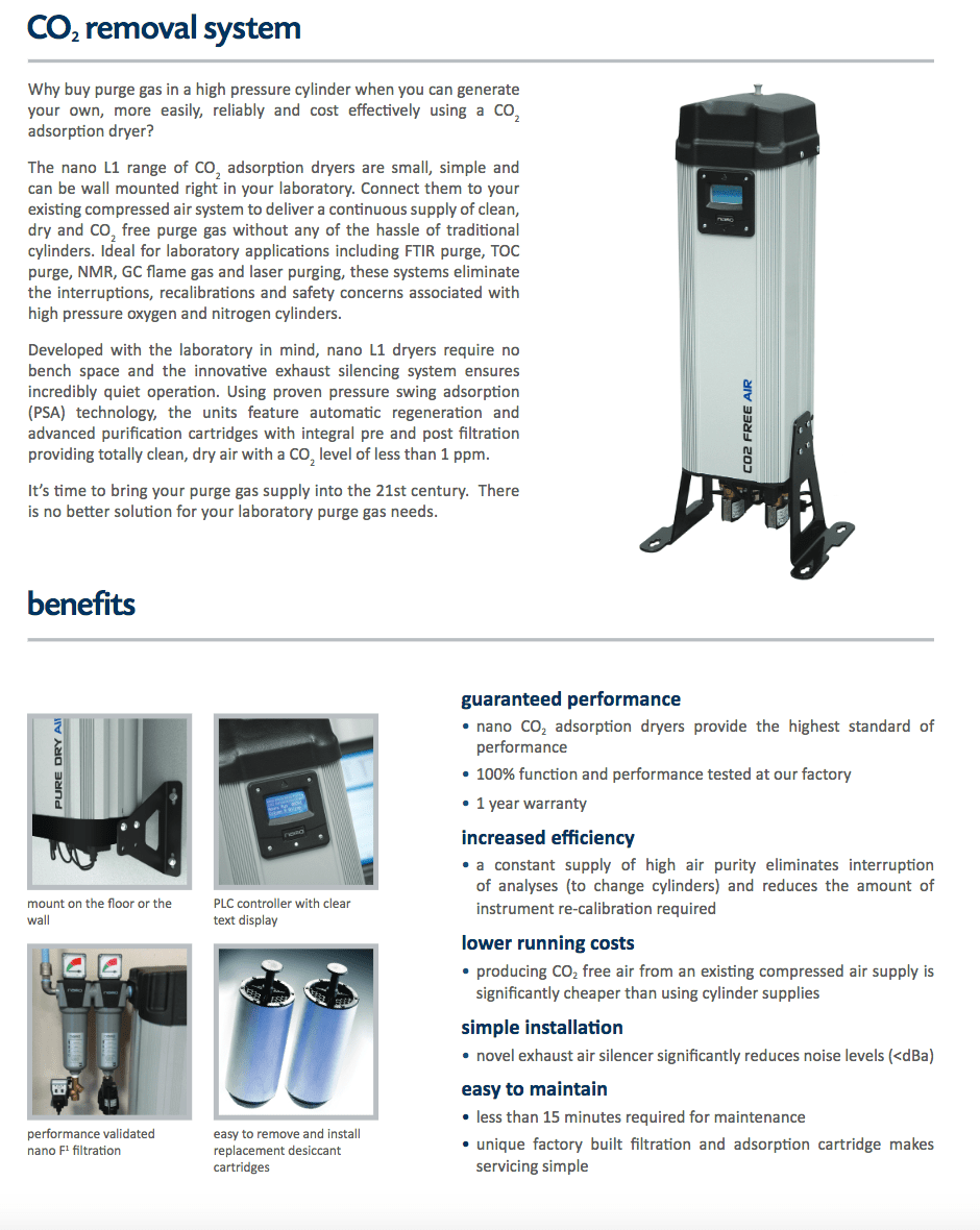 nano L1 range of lab gas CO2 free dryers provide clean, dry, CO2 free purge gas for your laboratory at a fraction of the cost of traditional cylinders.