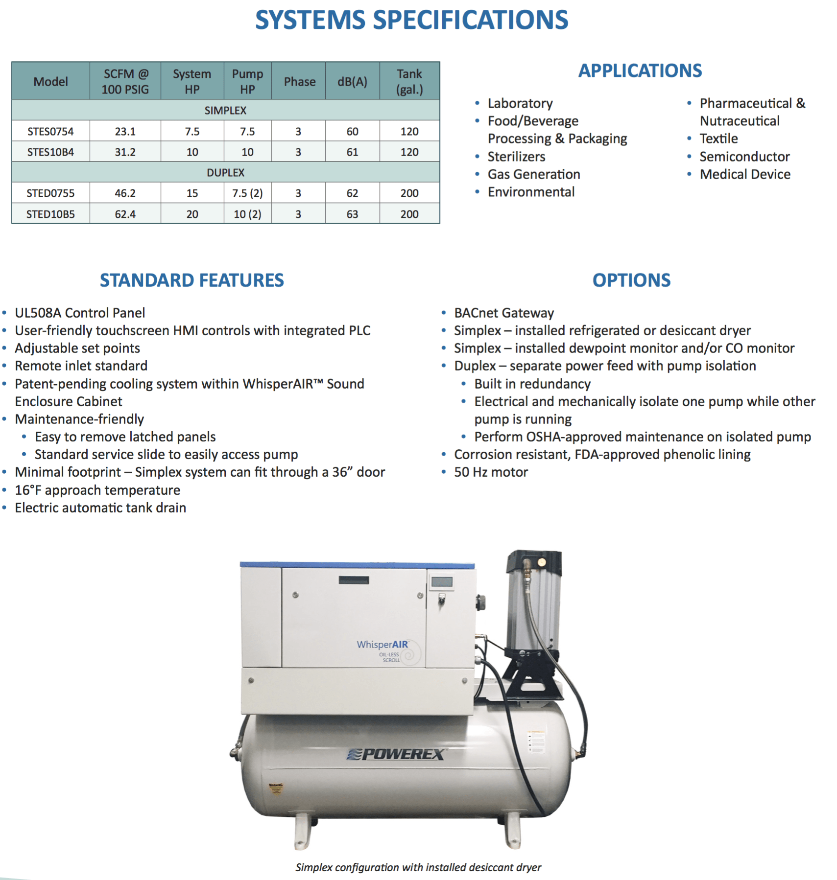 Powerex 10 HP Compressor World Latin America Oilless Scroll 120 Gallon Air Tank 31.2 CFM @ 100 PSI | 460V, 3-Phase | STES10B4-4-2