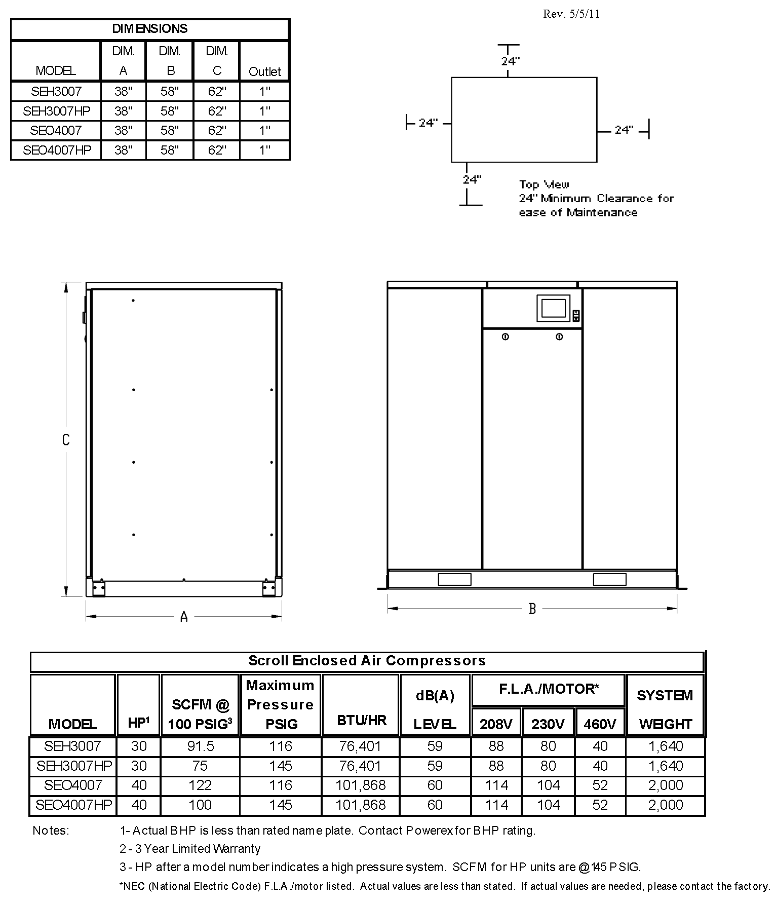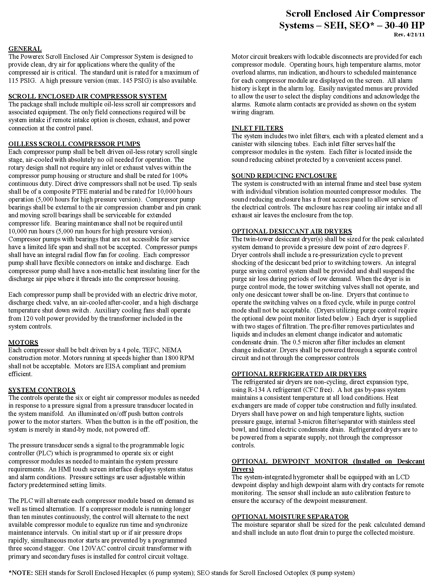 Powerex 30 HP Compressor World Latin America Oilless Scroll 145 PSI High Pressure |460 VOLT 3 PHASE | SEH3007-4-HP