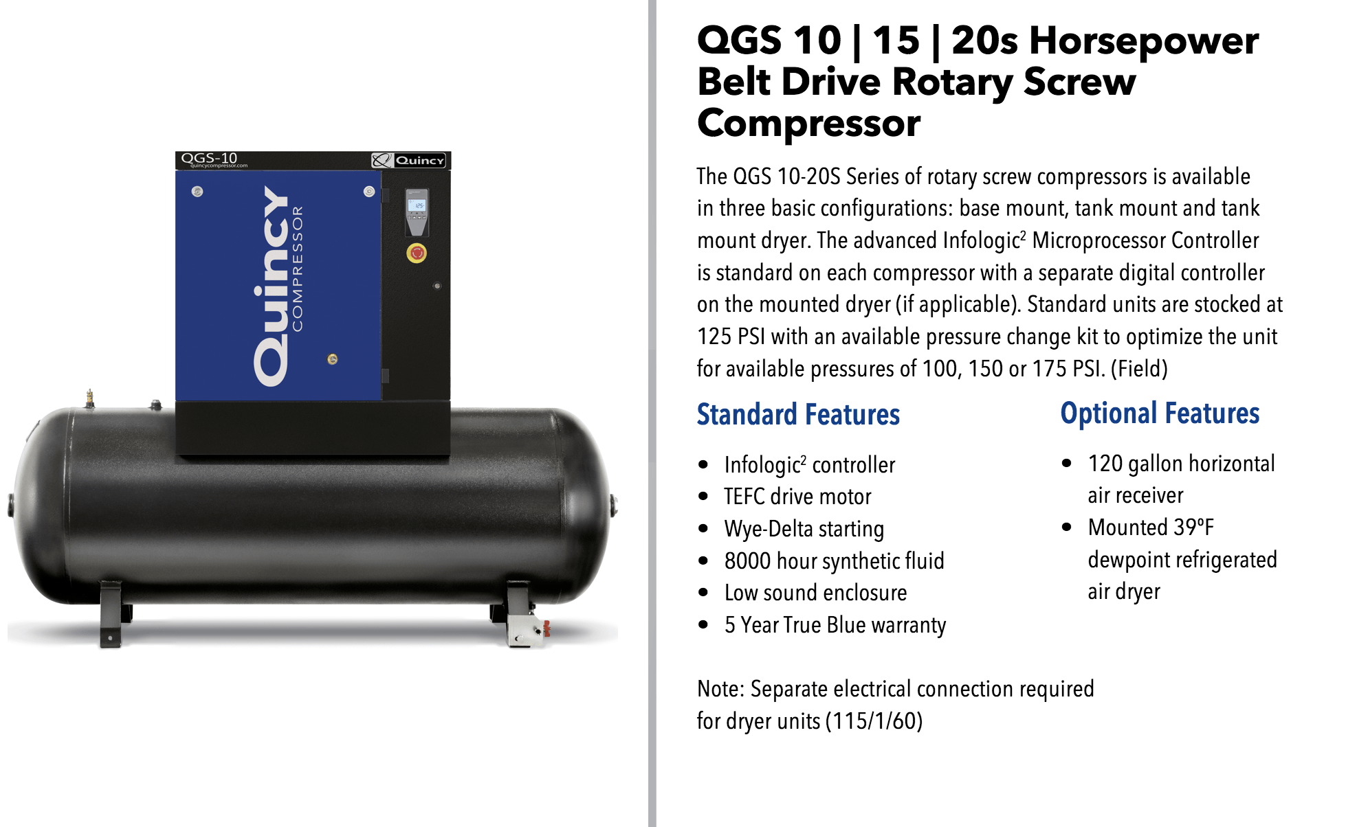 Tank Mounted Packages Includes - 120 gallon receiver tank with manual drain - Starter Mounted & Wired