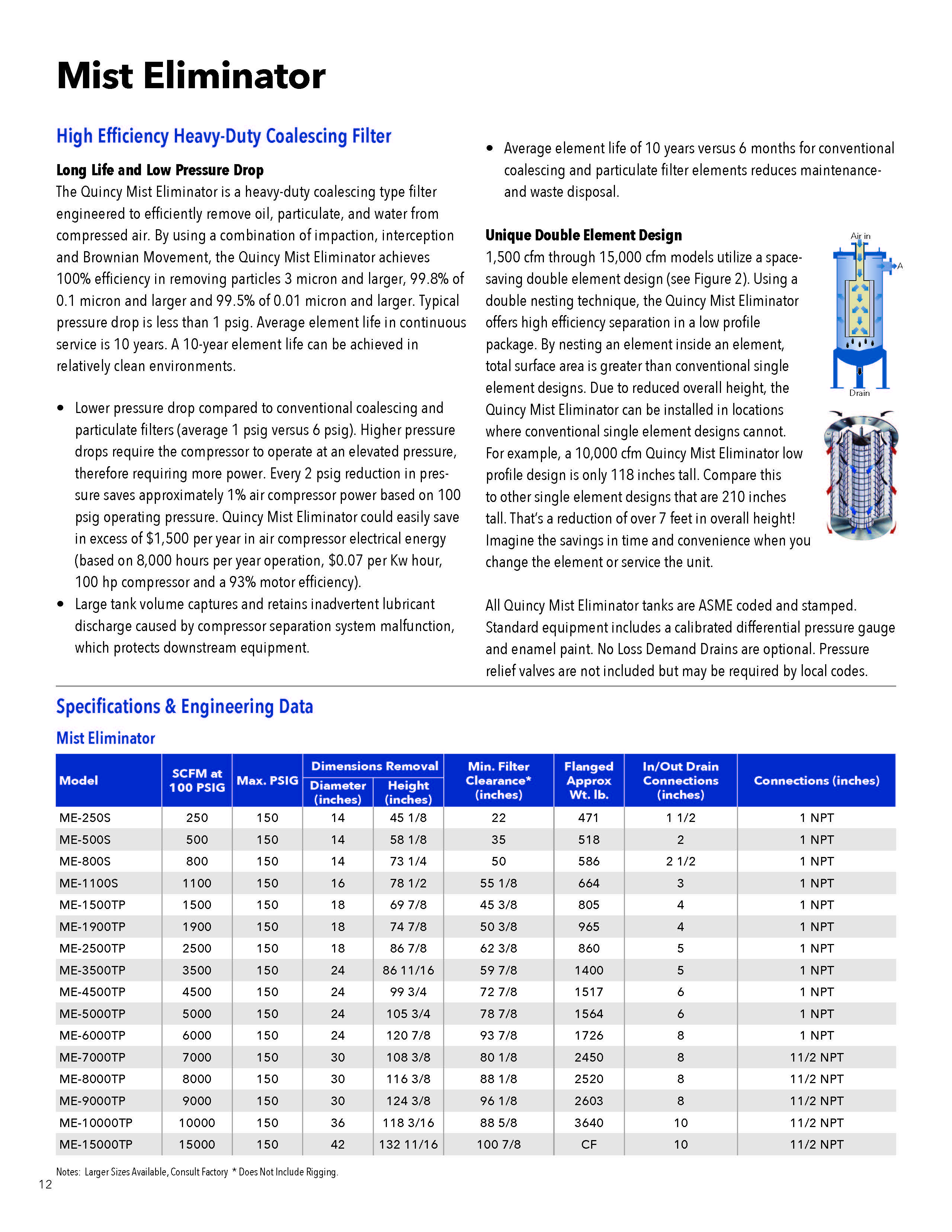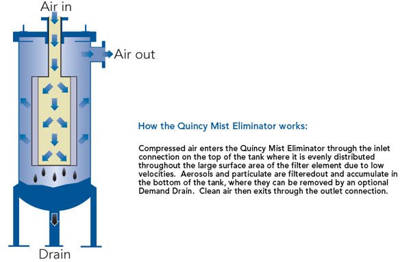 Quincy Compressor's Mist Eliminators are heavy-duty coalescing type filters engineered to efficiently remove oil, particulate, and water from compressed air. By using a combination of impaction, interception and Brownian Movement, the Mist Eliminator achieves 100 % efficiency in removing particles 3 micron and larger and 99.5 % efficiency in removing particles 0.01 micron and larger. Typical pressure drop is less than 1 PSID. Typical element life in continuous service is 10 years.