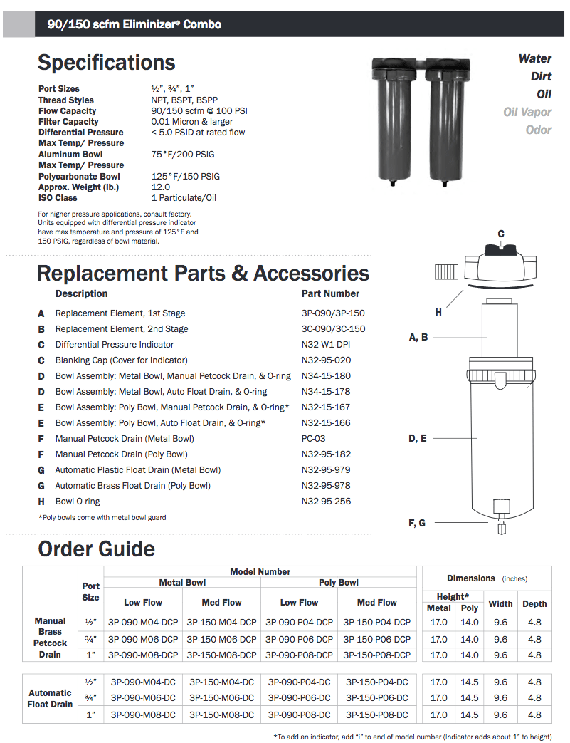 90 CFM Filter-Dryer Eliminizer Combo. Recommended on Compressor World Latin America 20 hp and smaller or 90 CFM applications.