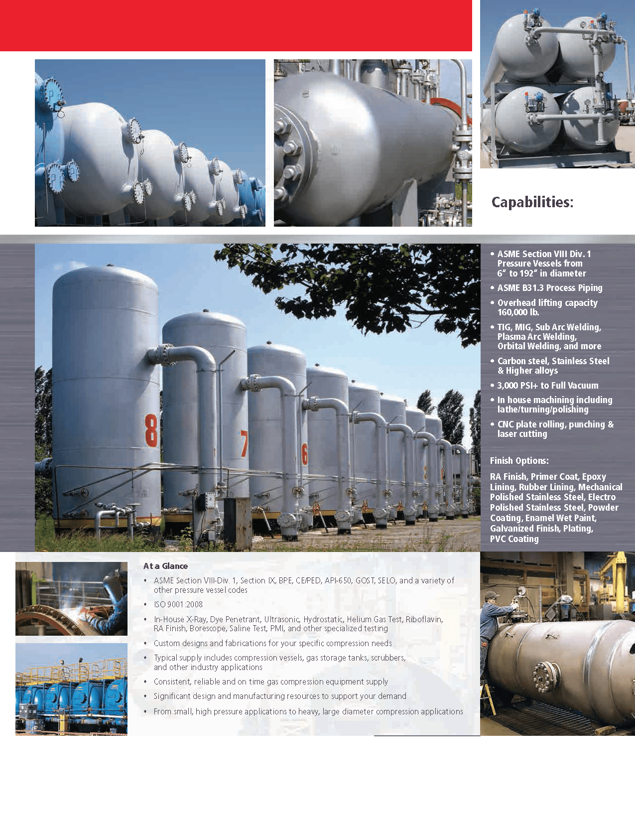 Manufacturing both small high volume production line tanks and larger specialty vessels.  They range in size from 4” to 120” diameters. There are three production lines serving the small tanks and one large production area for the specialty tanks.  In-house capabilities include application of primers and special coatings when specified by the customer.