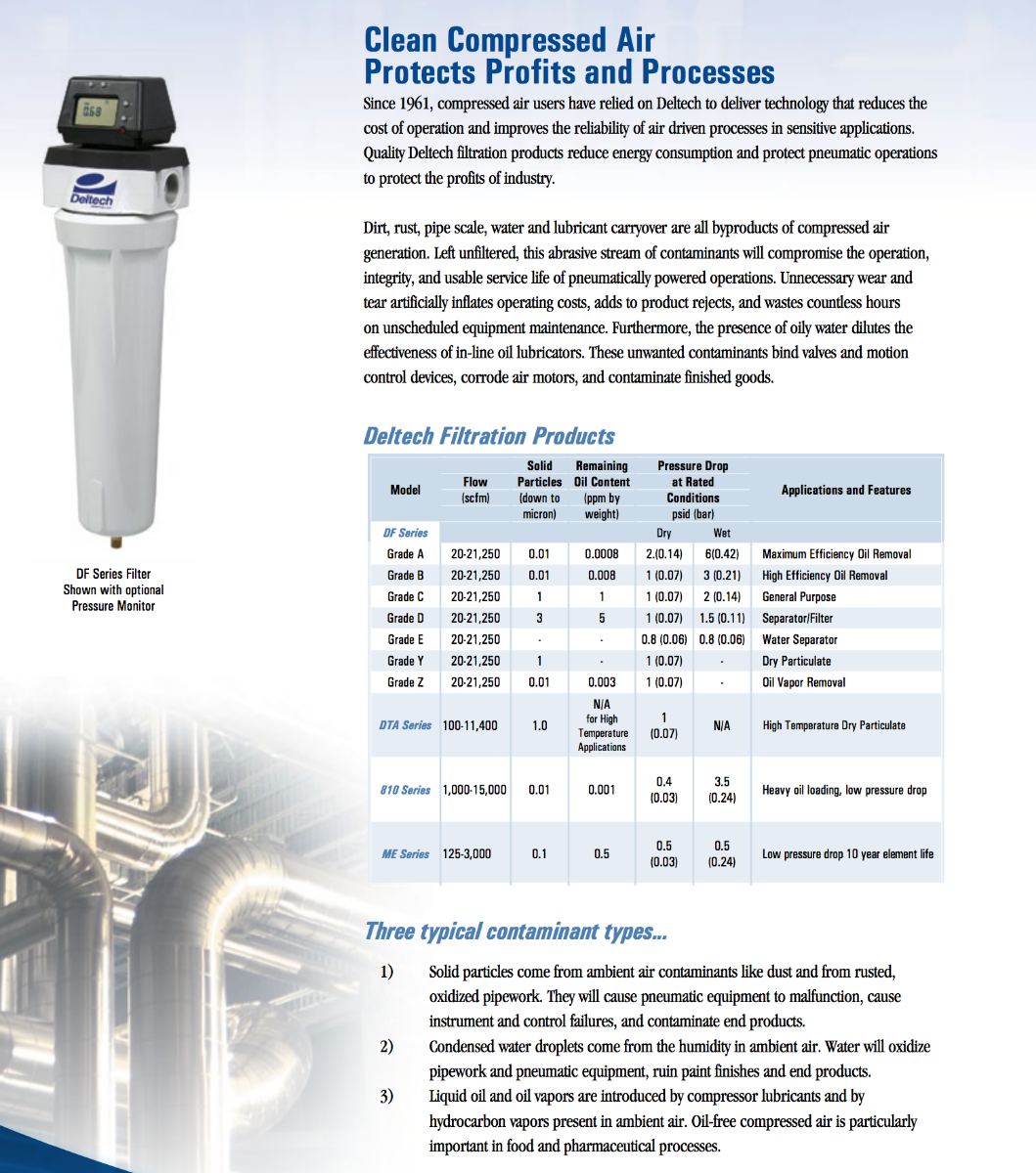 100 CFM, 1" NPT, DF100-D-8-DG Deltech Grade D Separator/Filter, 3.0 Micron Particulate Removal, Oil to 5 PPM with Liquid