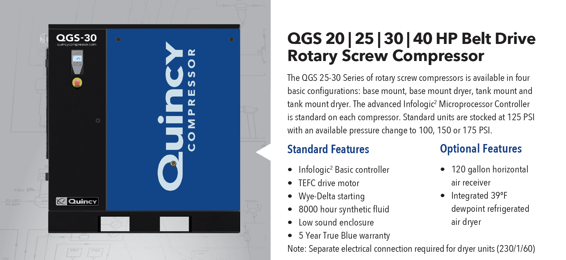 Quincy QGS 30 BMD | Compresor de Tornillo Rotativo Quincy 30 HP World Latinoamérica con Secador de Aire 208-230/460 Volt, Trifásico