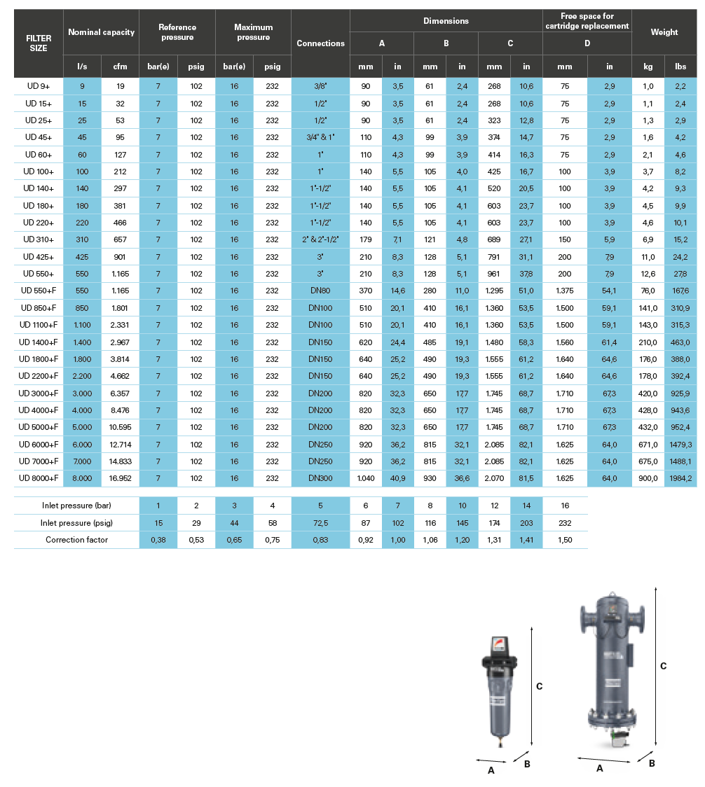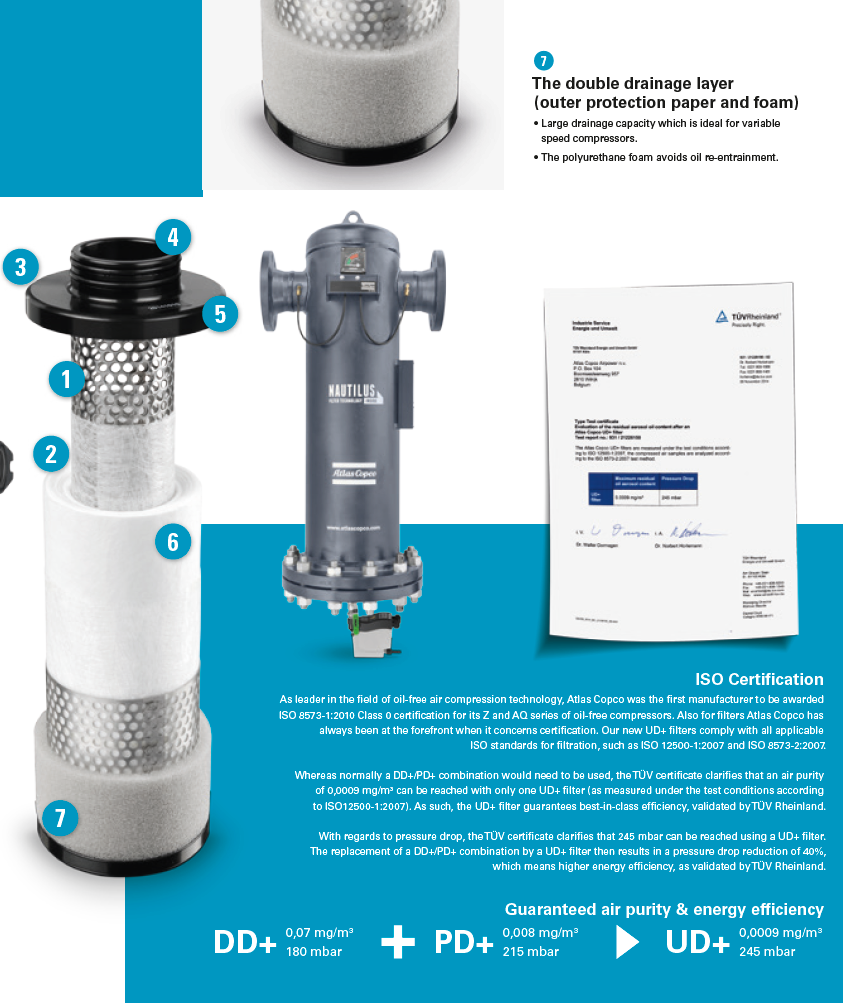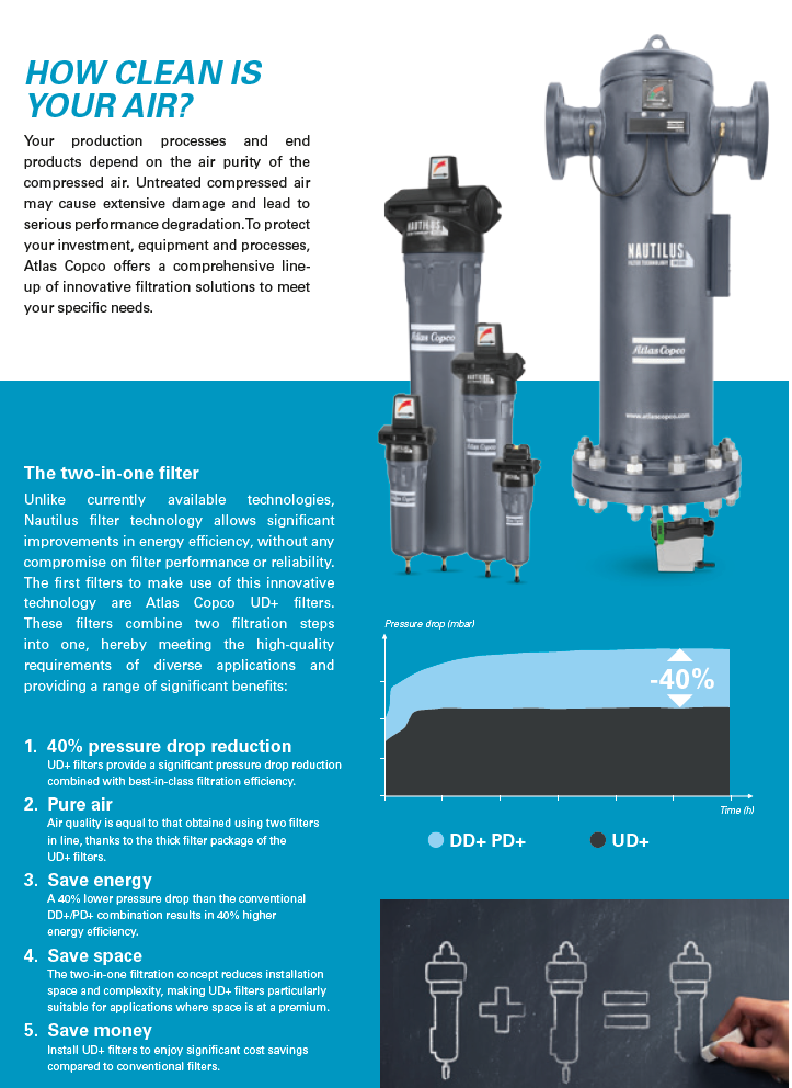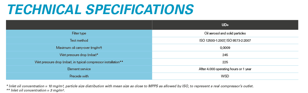 The UD+ series combines two filtration steps (DD+ and PD+) into a single unique technology that allows you to meet the high quality requirements of various applications while providing ultimate energy savings. However, they do not just save you money, but also space by eliminating the need for a second filter.