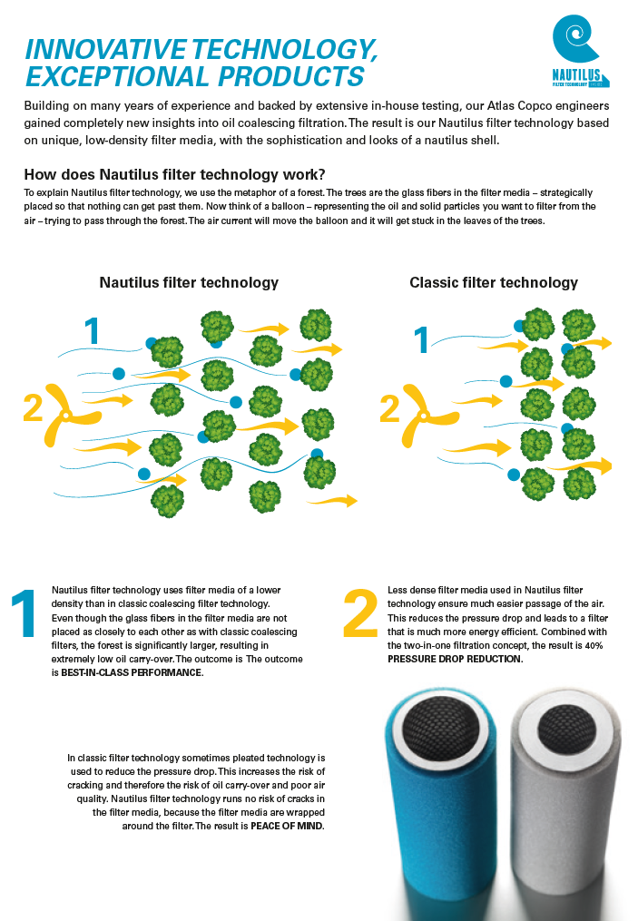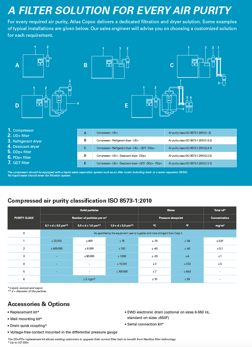 At the same time, these two-in-one coalescent filters protect your equipment and processes by efficiently reducing oil aerosol, wet dust and water droplets in your compressed air stream. The UD+ series ensures a lower pressure drop than a conventional filter combination, which results in energy savings. Thanks to the thick filter package, these filters also provide an air purity equal to that obtained by using two separate filters in a row.