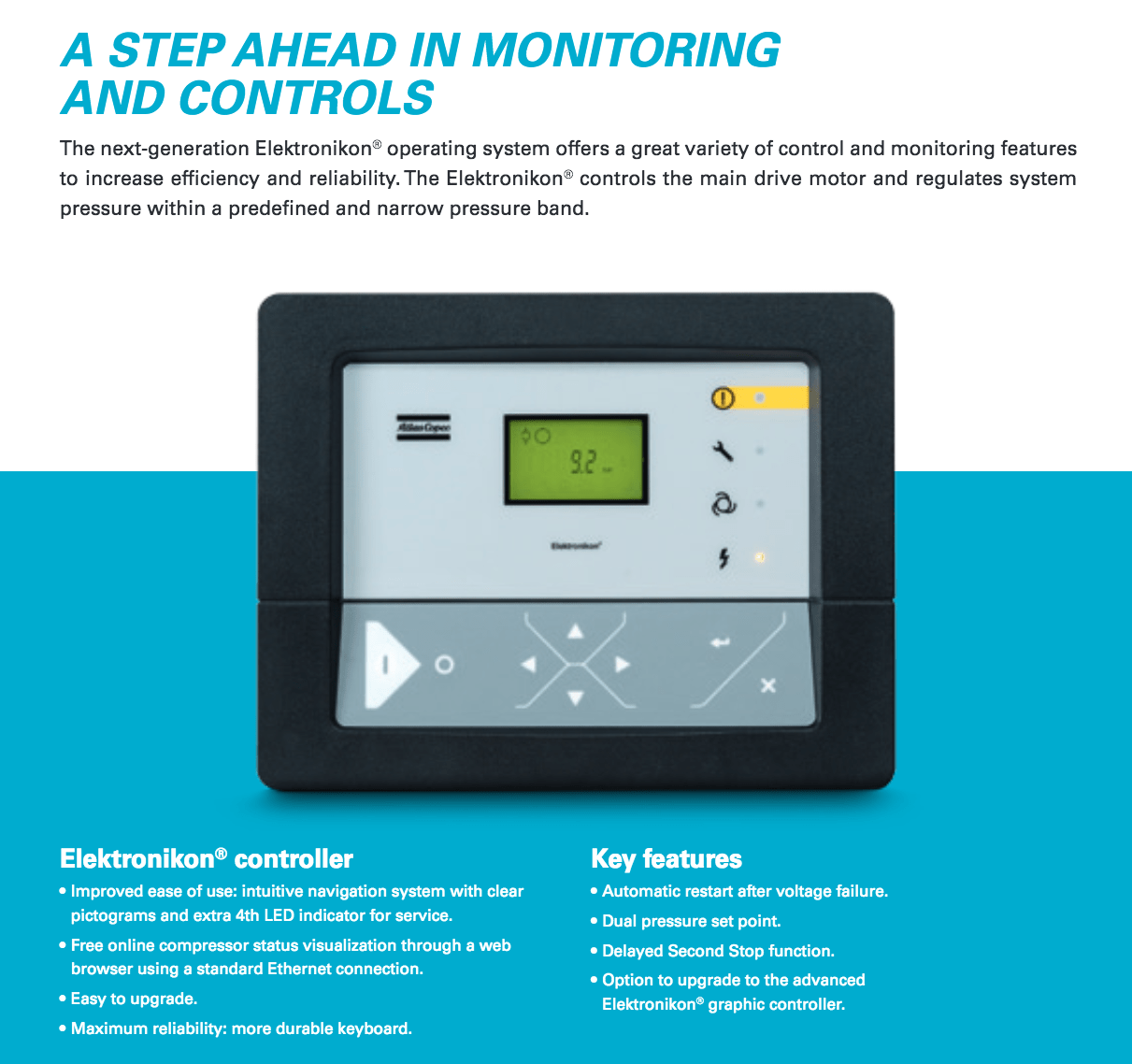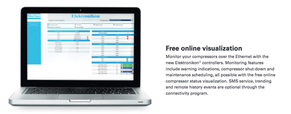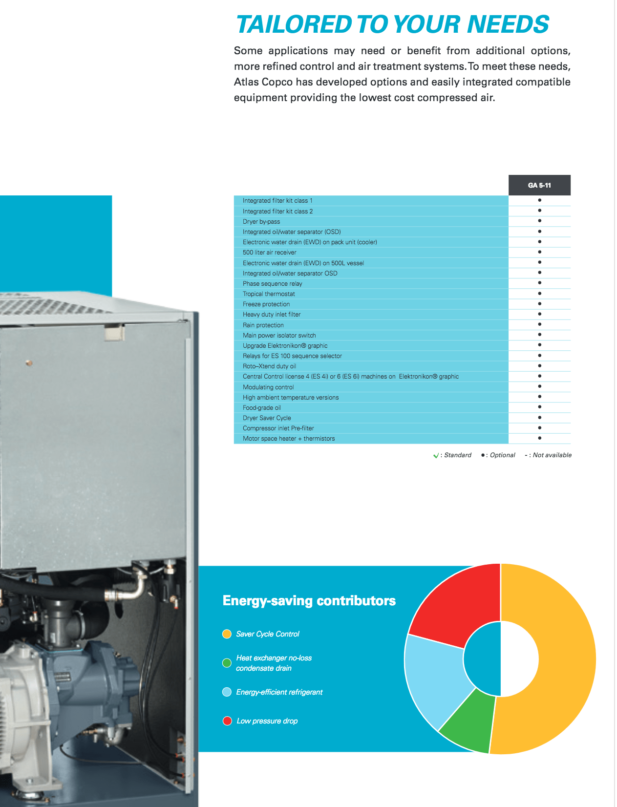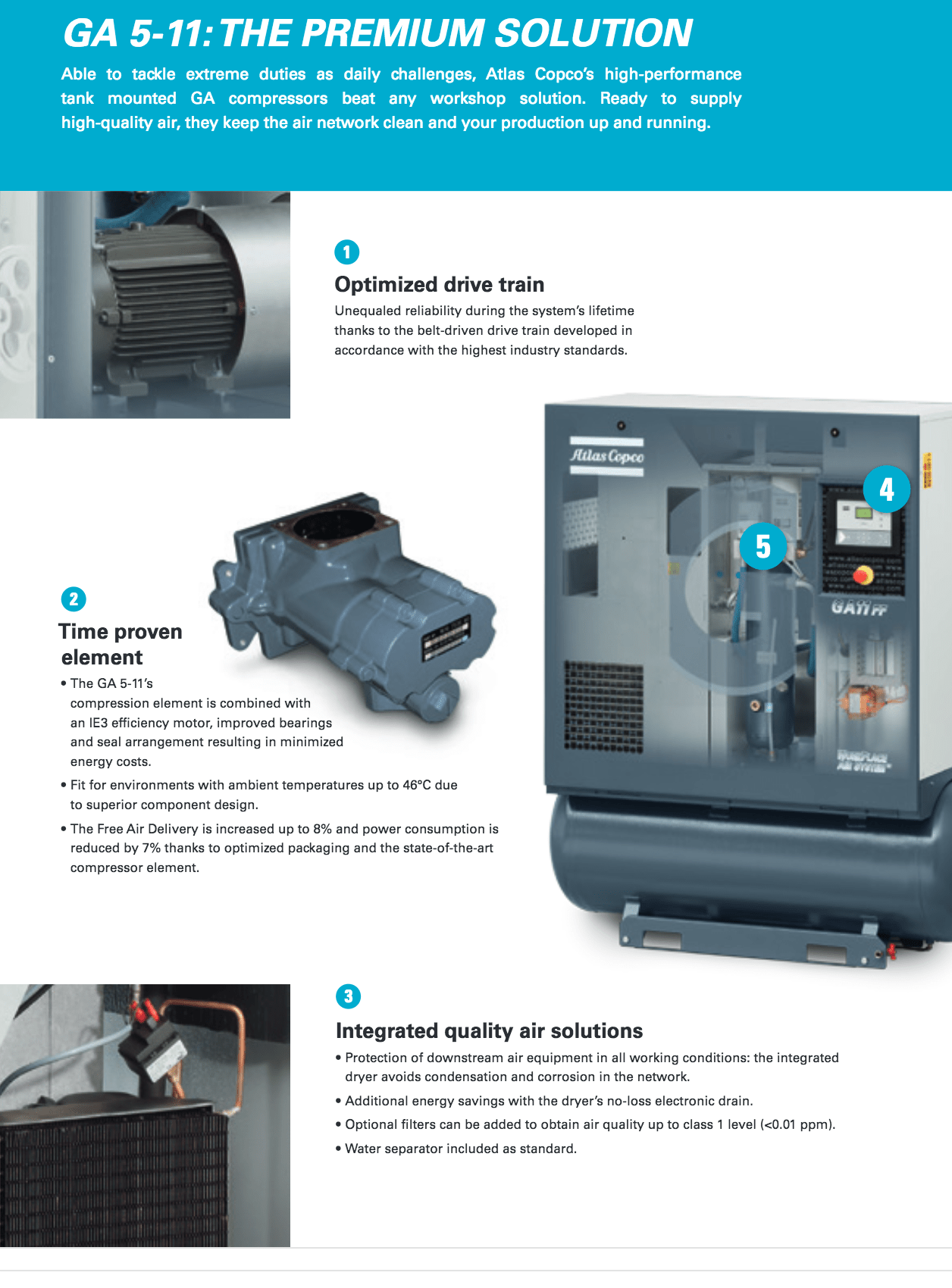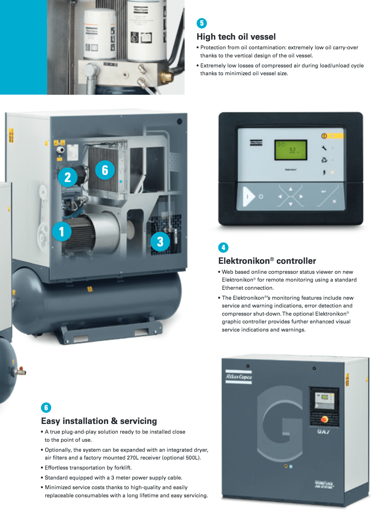 Atlas Copco GA Series- Single Stage, air-cooled and oil injected compressors. GA series compressors are available as Pack or Full Feature units.