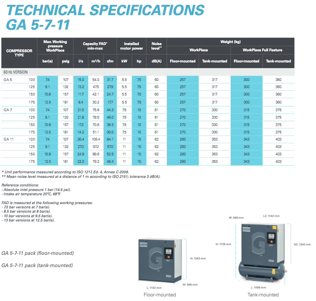 Atlas Copco 10 HP Rotary Screw Compressor World Latin America, Air Dryer & 71 Gallon Air Tank | 41.6 CFM @ 125 PSI | GA7-125T AFF 208-230/460, 71 Gallon | 8153005734