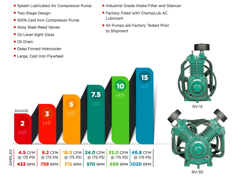 Compresor Champion de 15 HP World Latin America de dos etapas, 48,1 CFM a 125 PSI, 820 RPM, tanque de aire vertical de 120 galones, 230 voltios, trifásico | VRV15F-12
