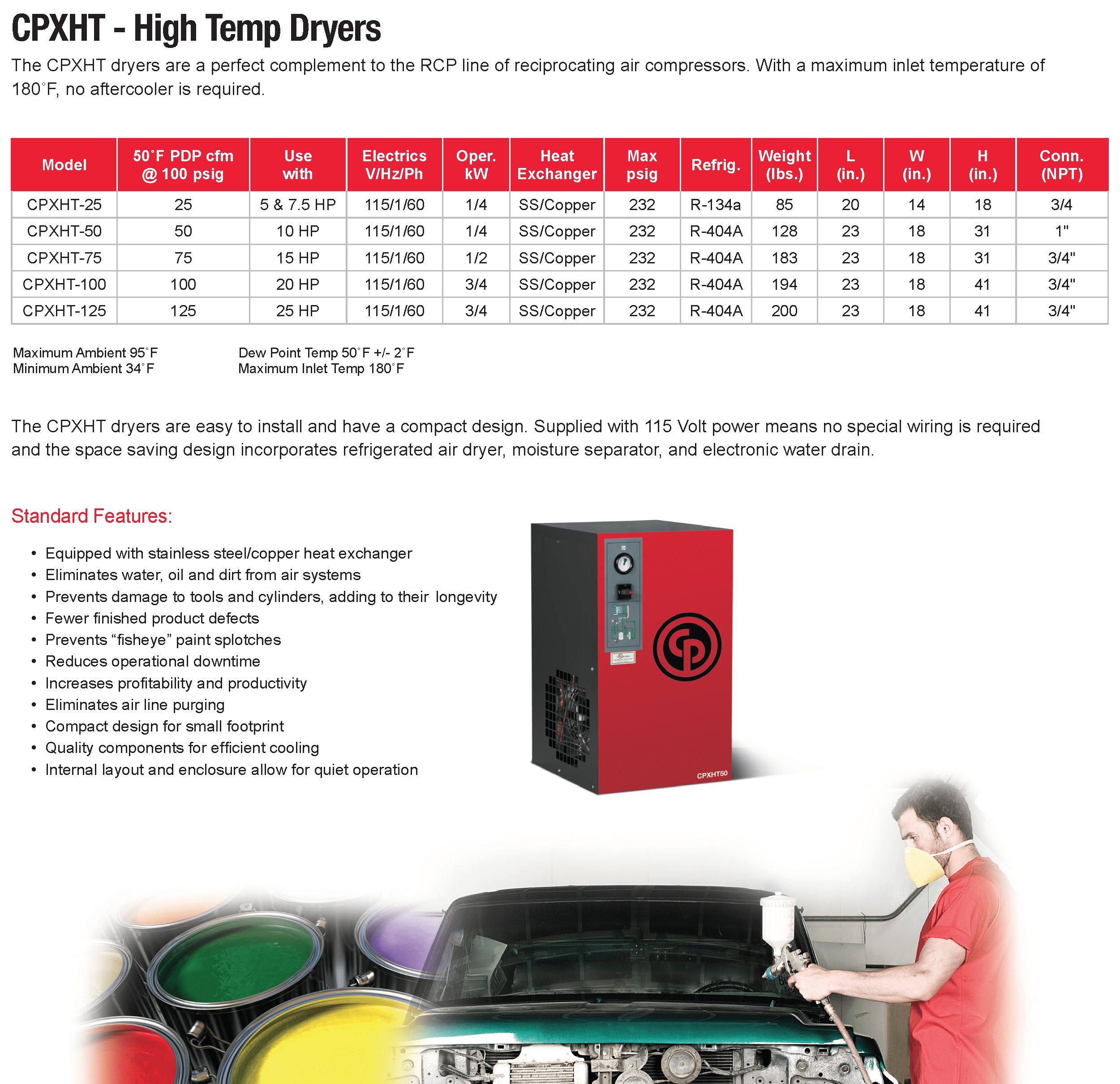 The CPXHT dryers are easy to install and have a compact design. Supplied with 115 Volt power means no special wiring is required and the space saving design incorporates an air cooled aftercooler, refrigerated air dryer, moisture separator, electronic water drain.