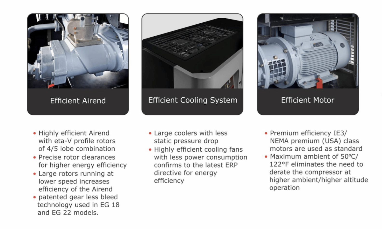 ENERGY EFFICIENCY AT BEST-IN-CLASS LEVELS - Here's where uptime meets efficiency: the same factors that produce greater uptime also maximize your energy efficiency. Slow running speeds, larger air ends, high efficiency motors, cooler running, cleaner air and low pressure losses are all hallmarks of the EG Series. They're also what make the EG Series stand out as a leader in energy efficiency.