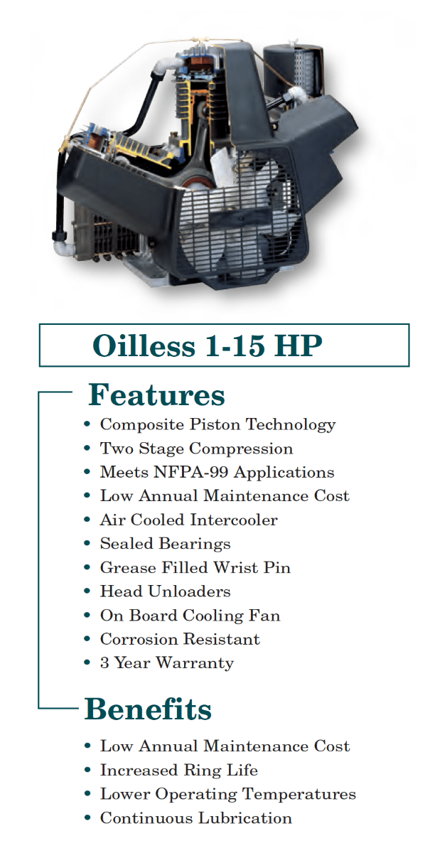 Powerex utilizes cutting edge compressor technology to provide the most advanced oilless reciprocating Compressor World Latin America in the industry.  The Powerex oilless reciprocating compressor is availab le in single and two stage models (Depending on the horsepower).  Continuously lubricated, sealed bearings provide oil-free conmpressed air and long compressor life.  The onboard fan, finned flywheel and temperature reducing composite piston created lower operating temperatures.