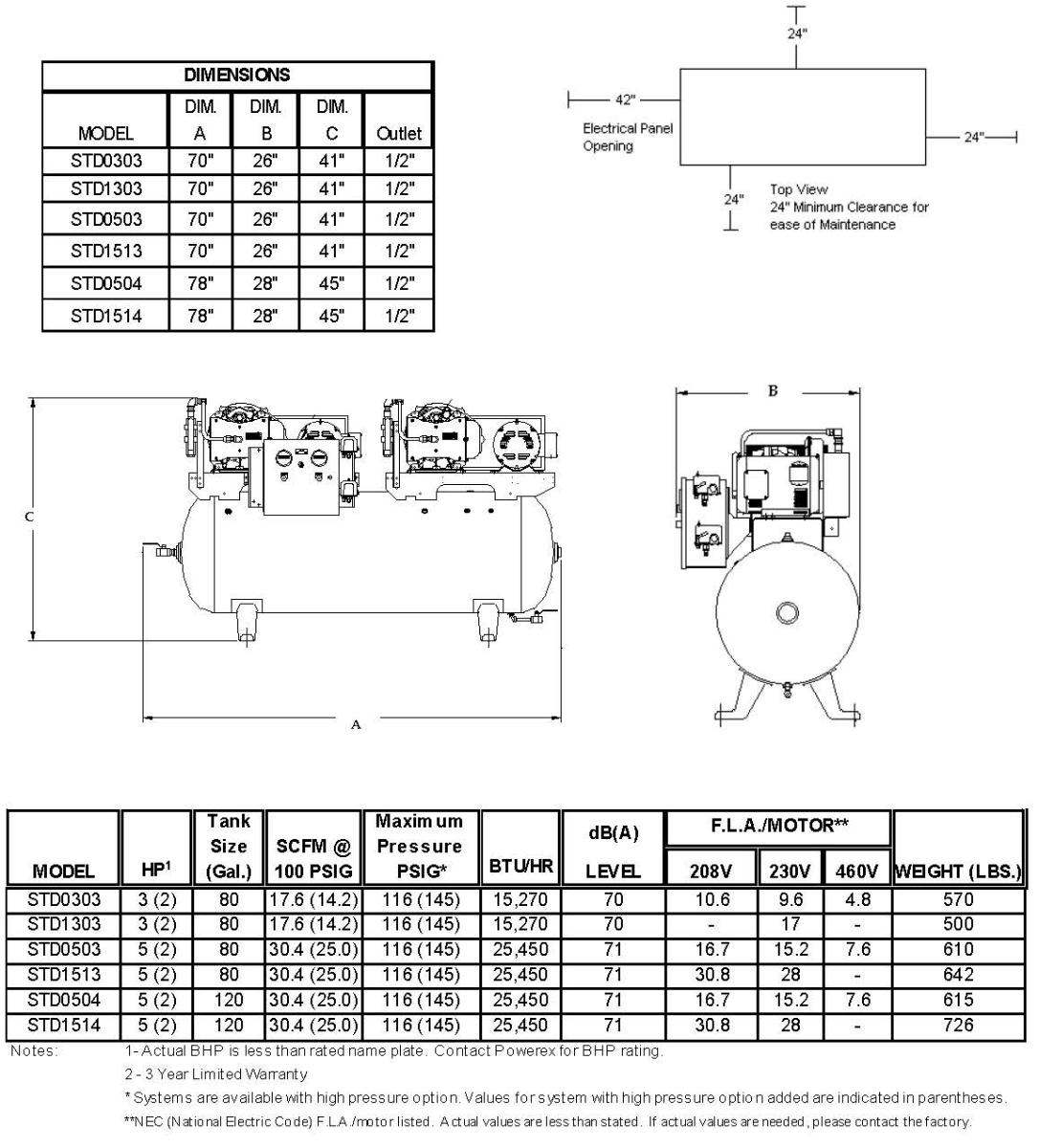 Powerex 3 HP Compressor World Latin America High Pressure Oilless Scroll 80 Gallon Tank | 460V, 3PH | STD0303-4-2-HP