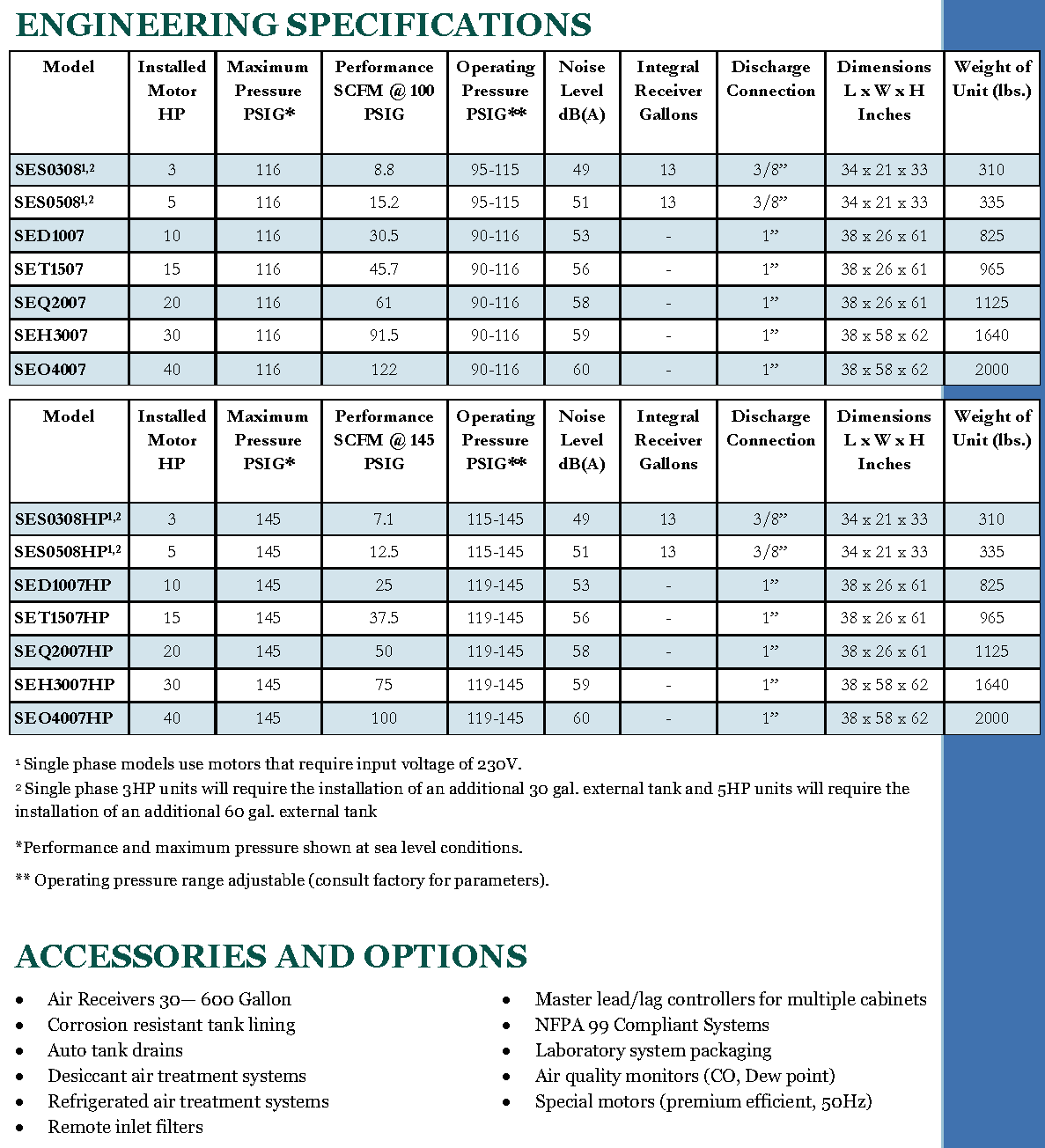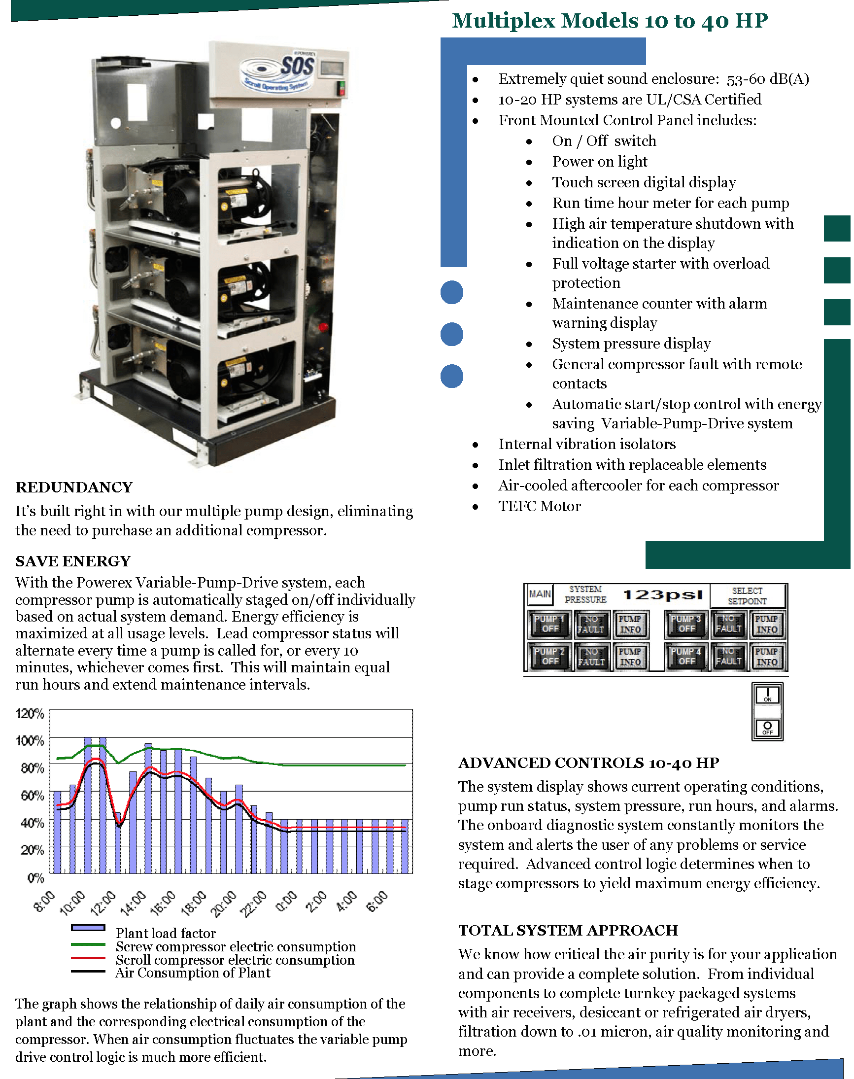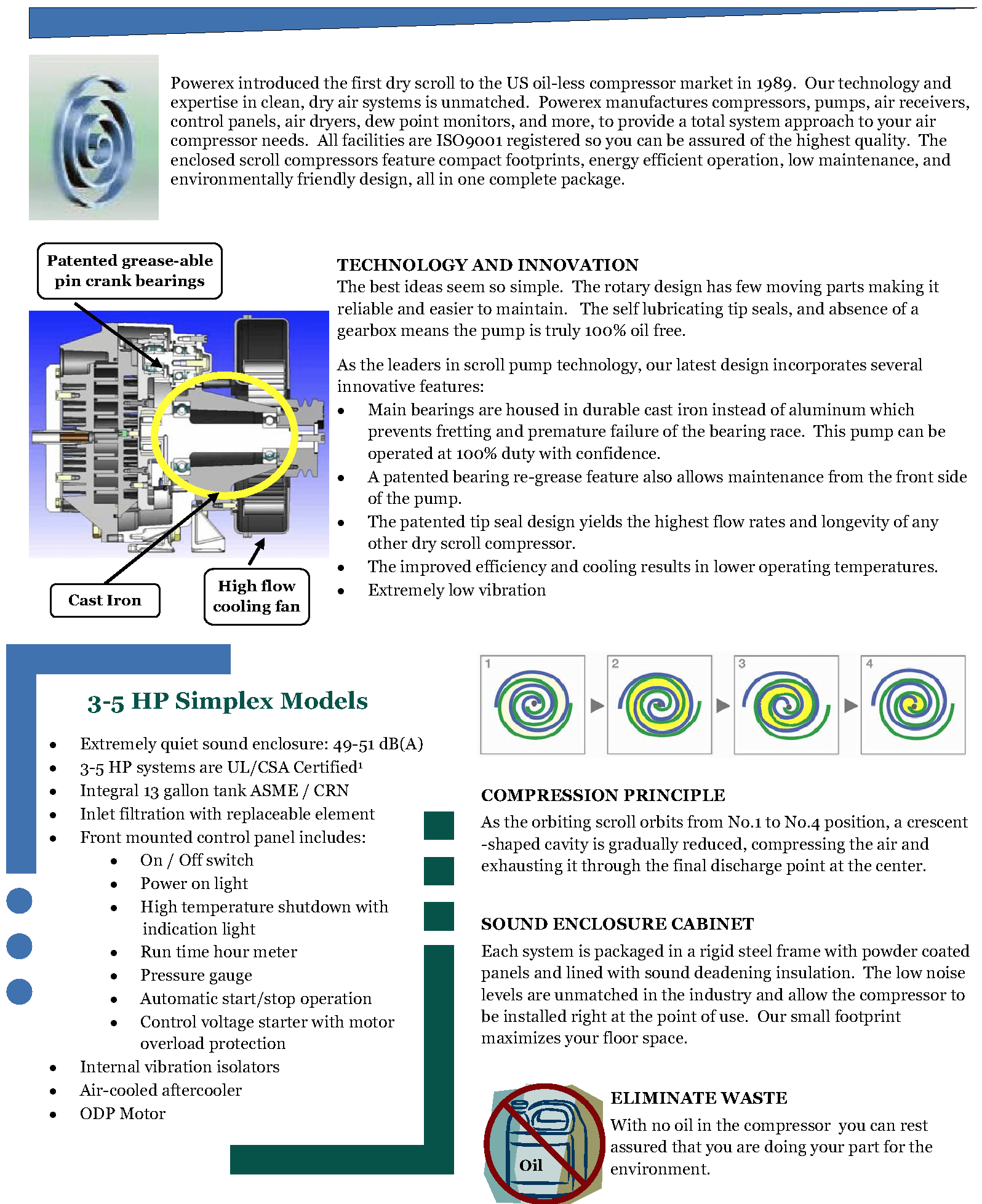 Our innovative scroll technology is completely oil-less, extremely quiet, energy efficient, and easy to maintain. The sound enclosure cabinet decreases noise levels even further, allowing the compressor system to be installed right at the point of use. The small footprint also helps maximize available floor space