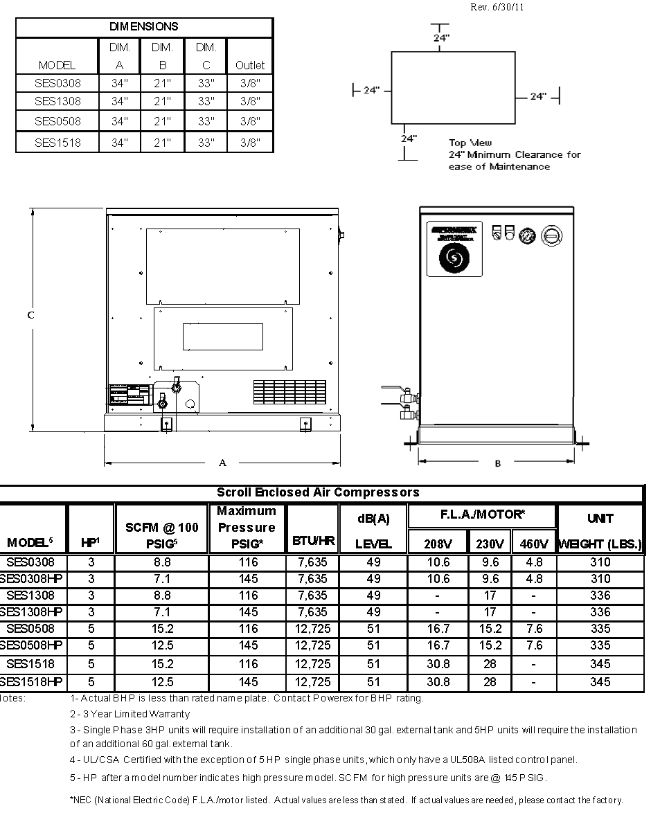 Powerex 5 HP Oilless Scroll Compressor World Latin America 15.2 CFM @ 100 PSI, 208-Volt 3-Phase with Electronic Drain| SES0508-2-2