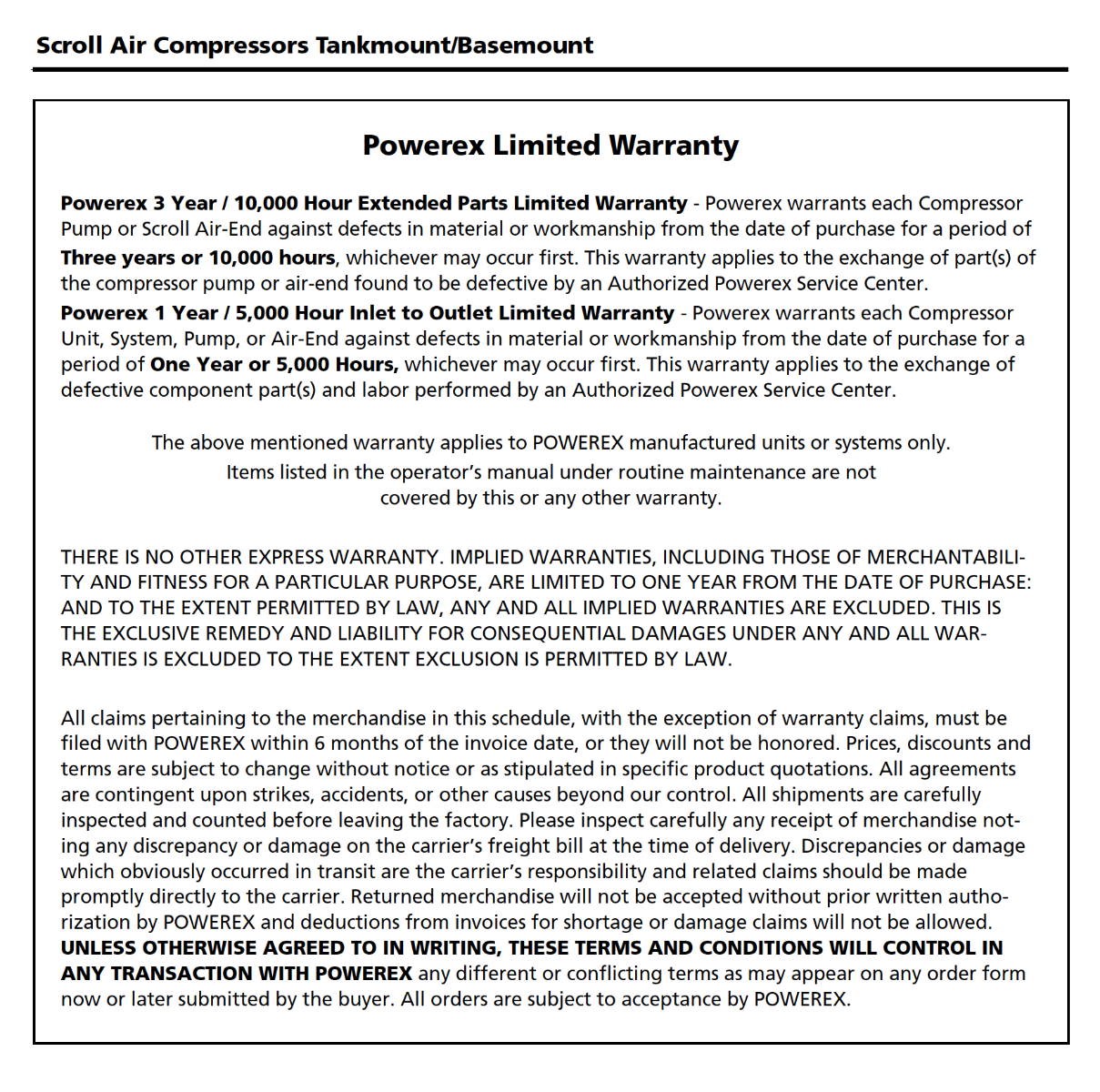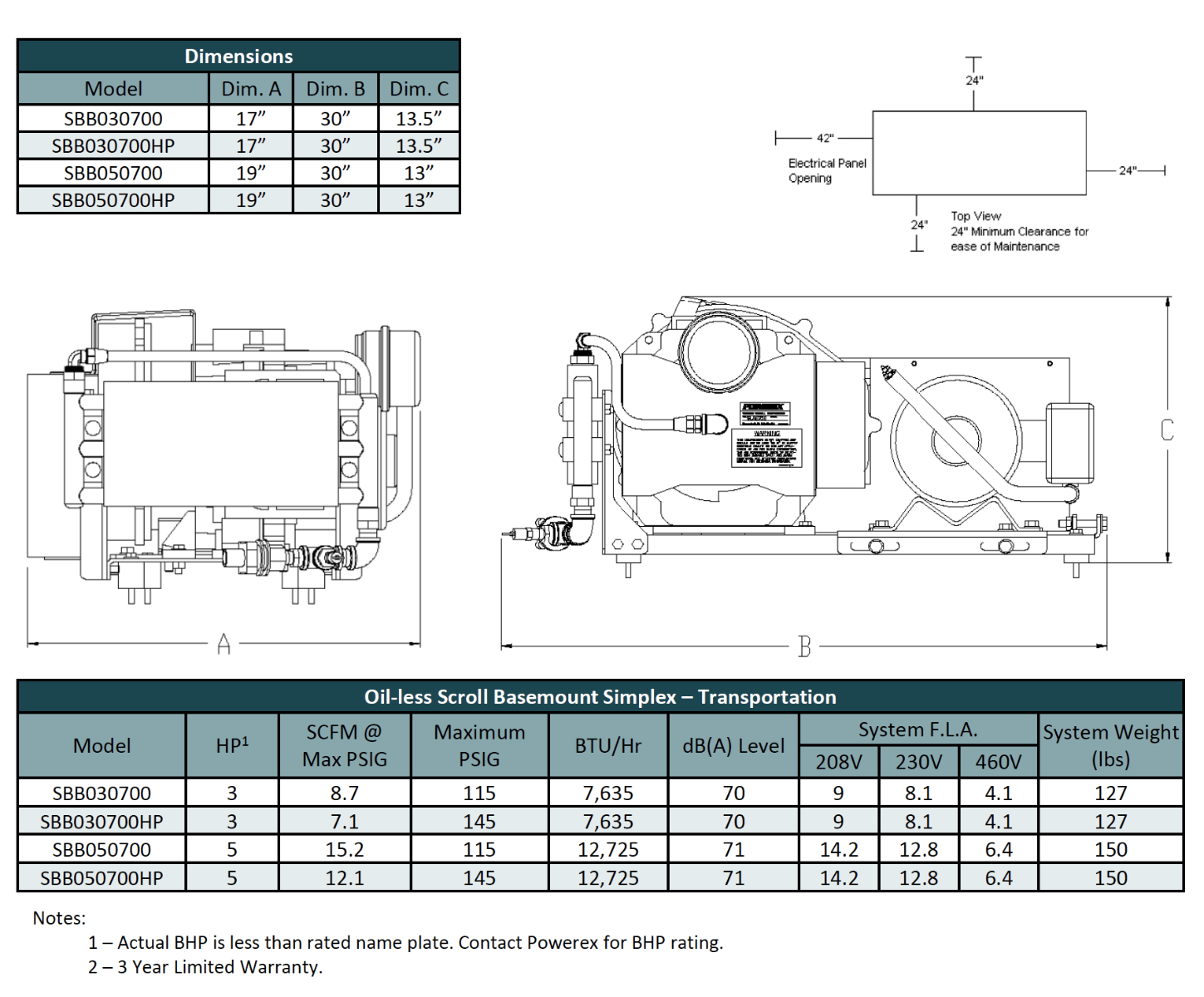 Powerex 5 HP Oilless Scroll Compressor World Latin America Basemount, 15.2 SCFM @ 100 PSI, 460 Volt, 3-Phase | SBS0507-40