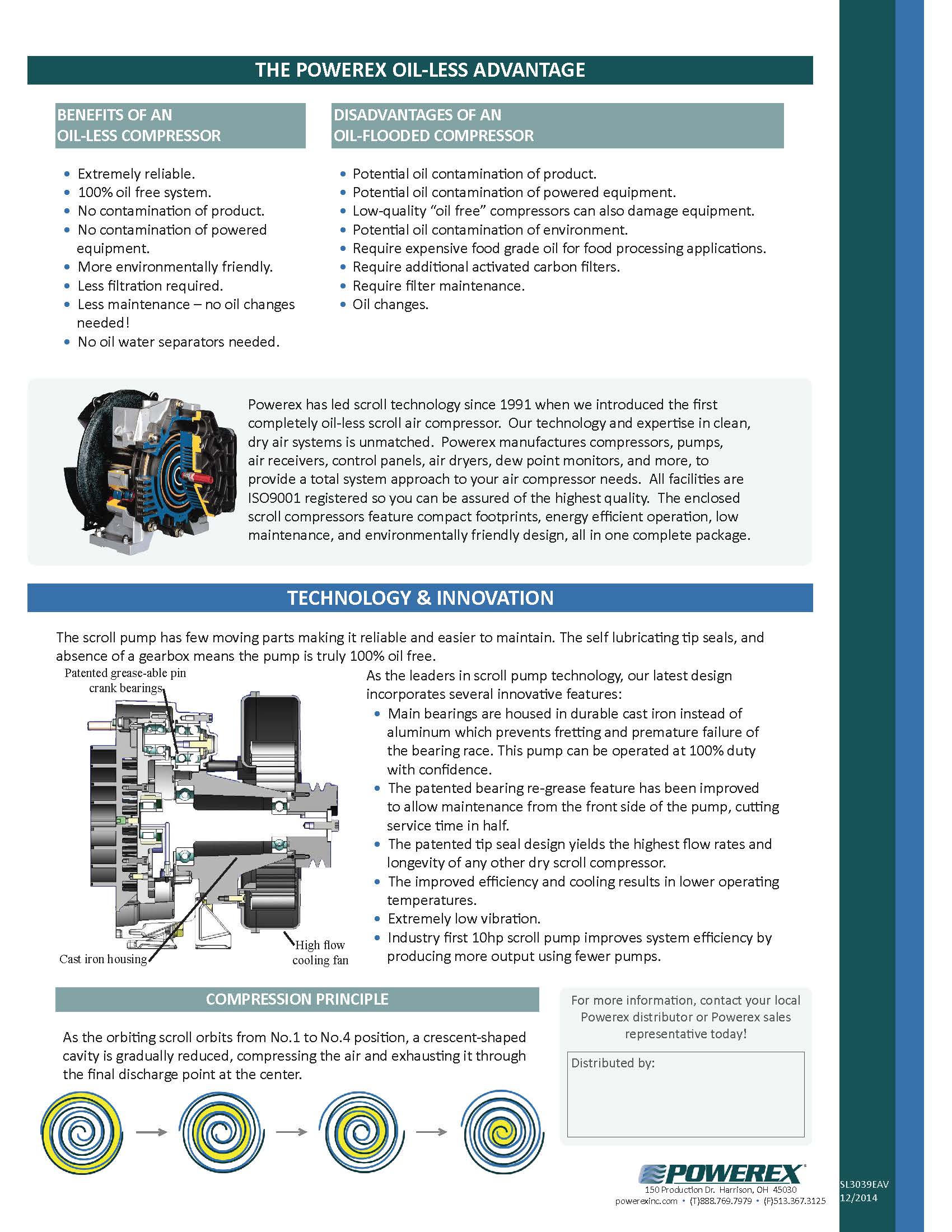 Our innovative scroll technology is completely oil-less, extremely quiet, energy efficient and easy to maintain. Mounting the scroll compressor on the tank itself maximizes available floor space and allows for easy access to the compressors for maintenance.
