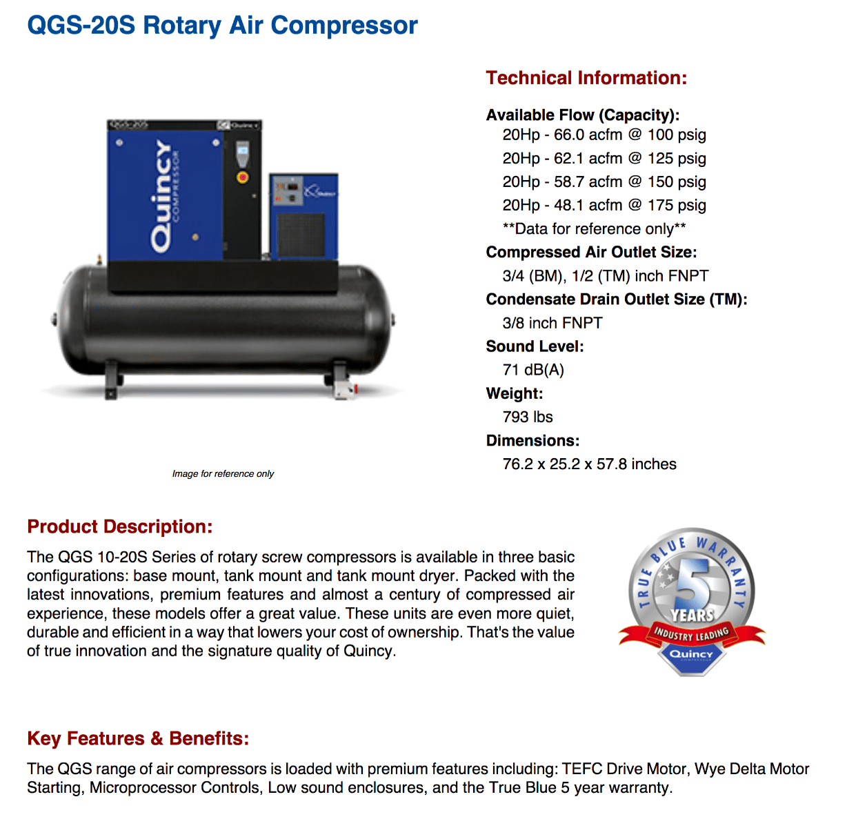 With ease of service and reliability in mind, the Quincy QGS offers superior compressed air performance in a compact, modern design. With a continuous 100% duty cycle, this rotary screw compressor also operates without the elevated vibration and sound levels normally associated with typical piston compressors. A small footprint and lower noise levels mean increased installation flexibility, making the Quincy QGS ideal for most applications. And, with the optional receiver tank and integrated dryer, you will save valuable floor space and lower your cost of operation.