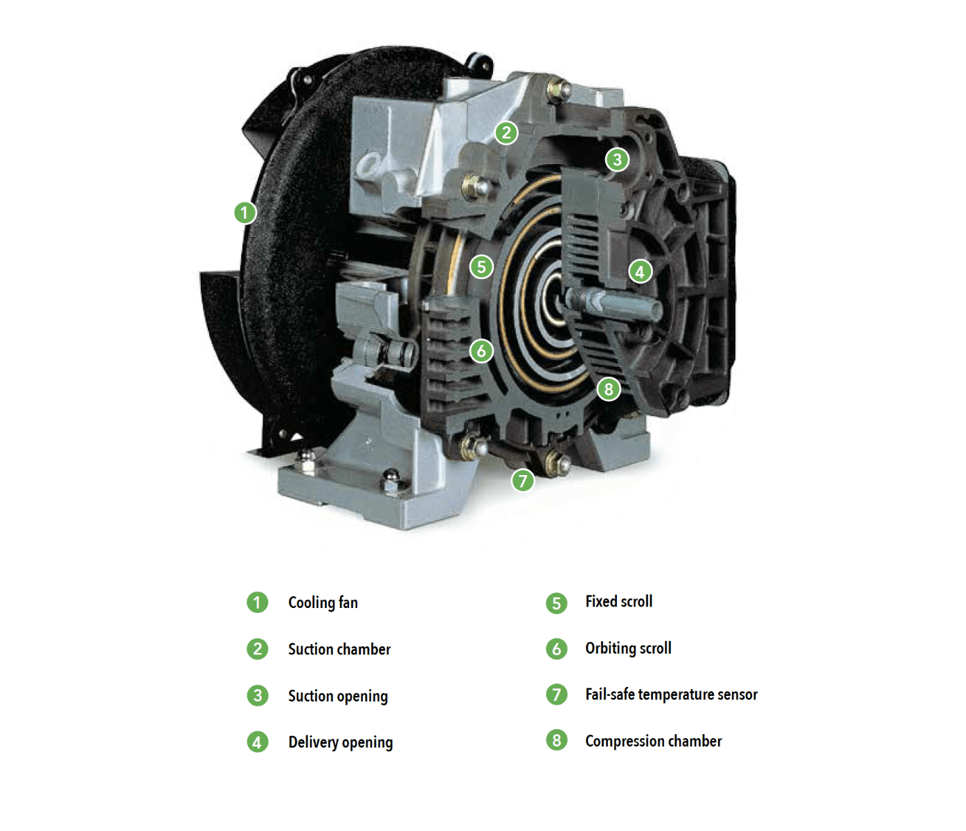 Air compression is achieved through the orbital motion of two spirals. One stationary, the second mobile, their interaction pulls the air into the compression chamber. In a regular and continuous way, the mobile spiral compresses the air through a reduction of the volume. The air flow is directed to the center of the spiral after which it is cooled. As the spirals never make any contact, this compression process does not require any lubrication. Consequently, the QOF series compressors guarantee 100% oil-free compressed air.