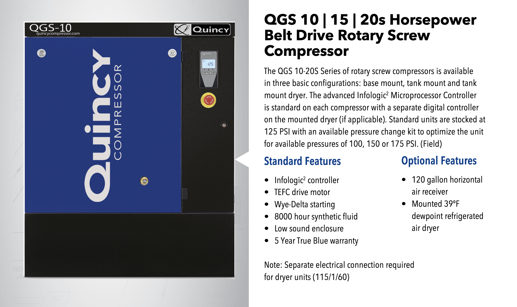 With ease of service and reliability in mind, the Quincy QGS offers superior compressed air performance in a compact, modern design. With a continuous 100% duty cycle, this rotary screw compressor also operates without the elevated vibration and sound levels normally associated with typical piston compressors. A small footprint and lower noise levels mean increased installation flexibility, making the Quincy QGS ideal for most applications. And, with the optional receiver tank and integrated dryer, you will save valuable floor space and lower your cost of operation.