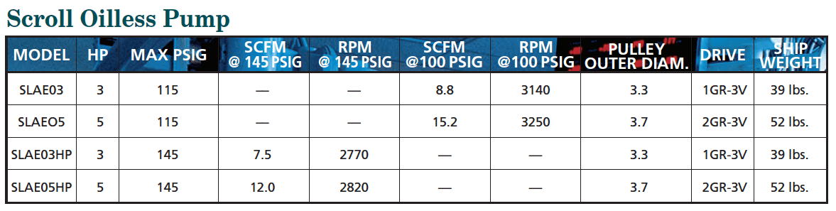 The compressor/s shall be belt driven oil-less rotary scroll single stage, air-cooled oil-less construction with absolutely no oil needed for operation. The rotary design shall not require any inlet or exhaust valves and shall be rated for 100% continuous duty. Direct drive compressors shall not be used. Tip seals shall be of a composite PTFE material and be rated for 10,000 hours operation or 5,000 hours if high pressure. Compressor bearings shall be external to the air compression chamber and shall all be serviceable for extended compressor life. Bearing maintenance shall not be required until 10,000 run hours. Compressors with bearings that are not accessible for service have a limited life span and shall not be accepted. Compressors shall have an integral radial flow fan for cooling and shall not require and additional electrical cooling fans.