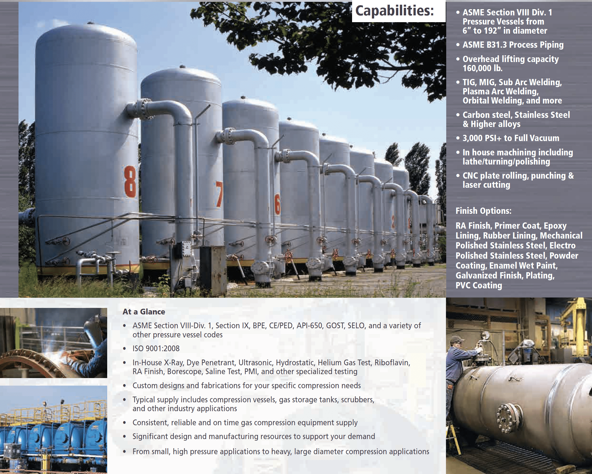 We offer a wide range of capabilities in fabricating stock, custom and engineered-to-order vessel designs. Materials include carbon, stainless steel and other high alloy metals. Vessel fabrications range from 6” to 192” in diameter, up to 160,000+ pounds and pressures from fully vacuum to 3,000 PSI.