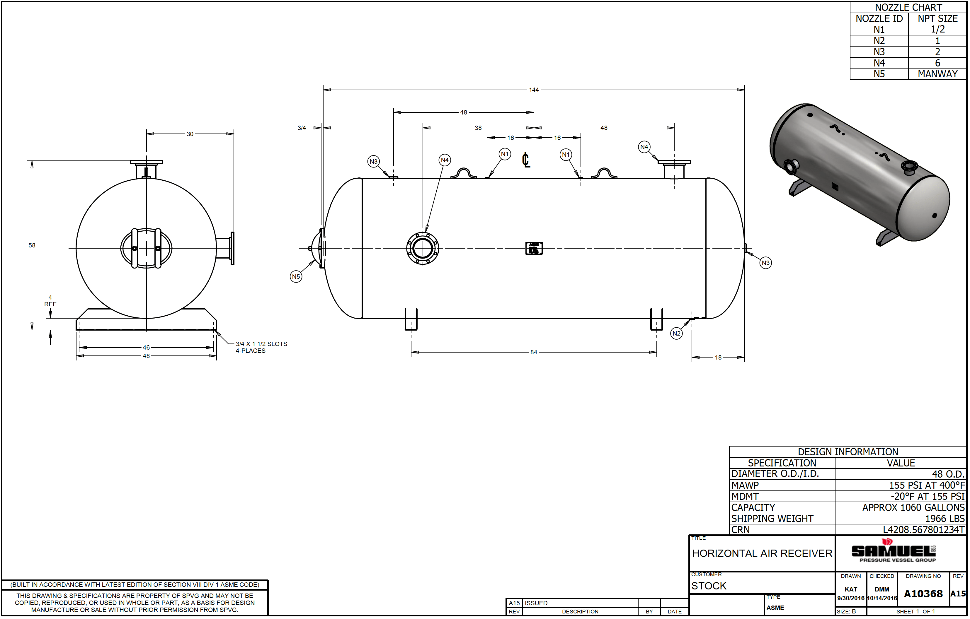 1060 Gallon Air Tank Horizontal with Saddles, 48" x 144", 200 PSI, ASME Coded | A10368-200