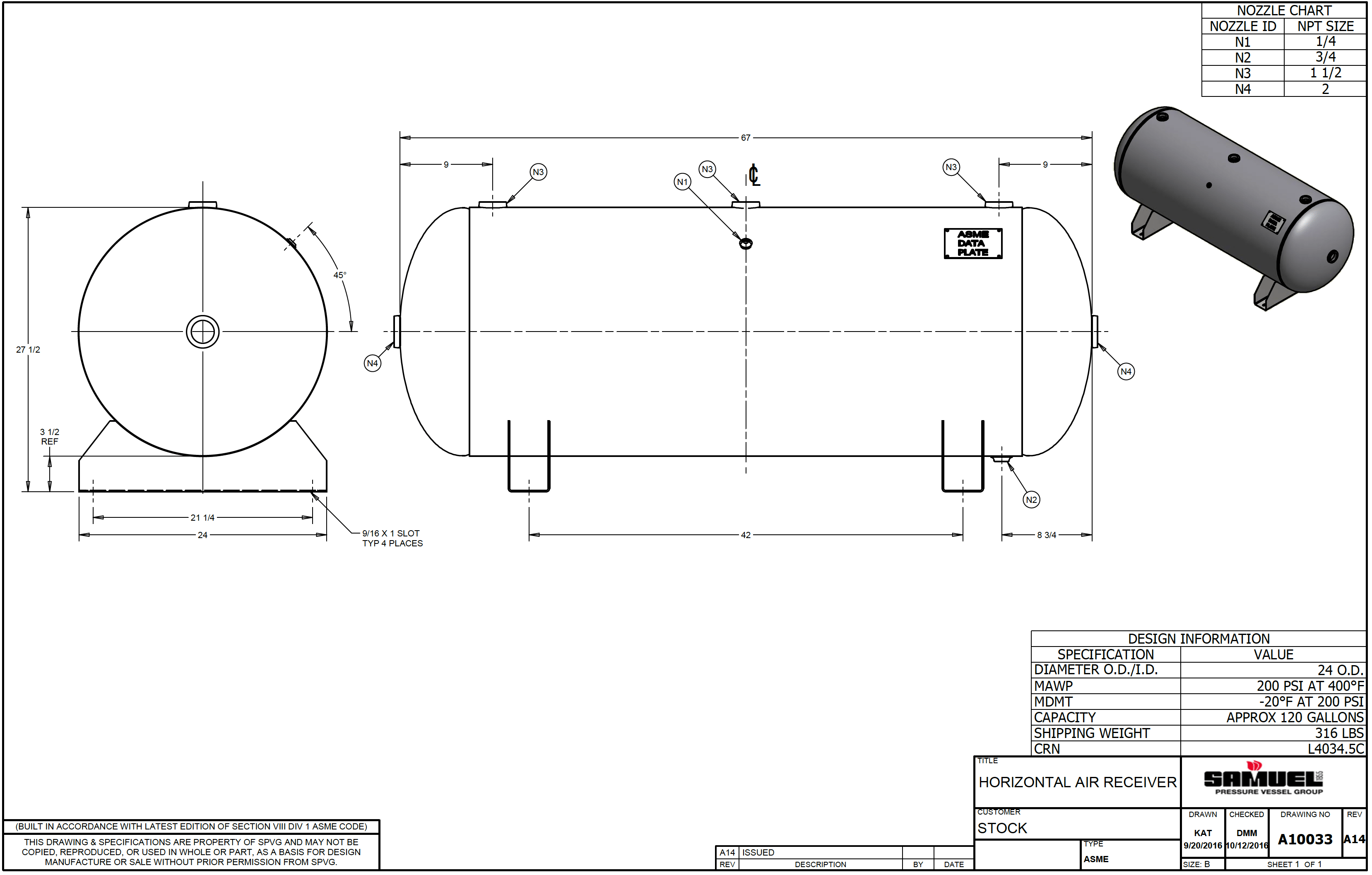 120 Gallon Horizontal Air Tank, 24" x 67" with Saddle Legs, 200 PSI, ASME | A10033