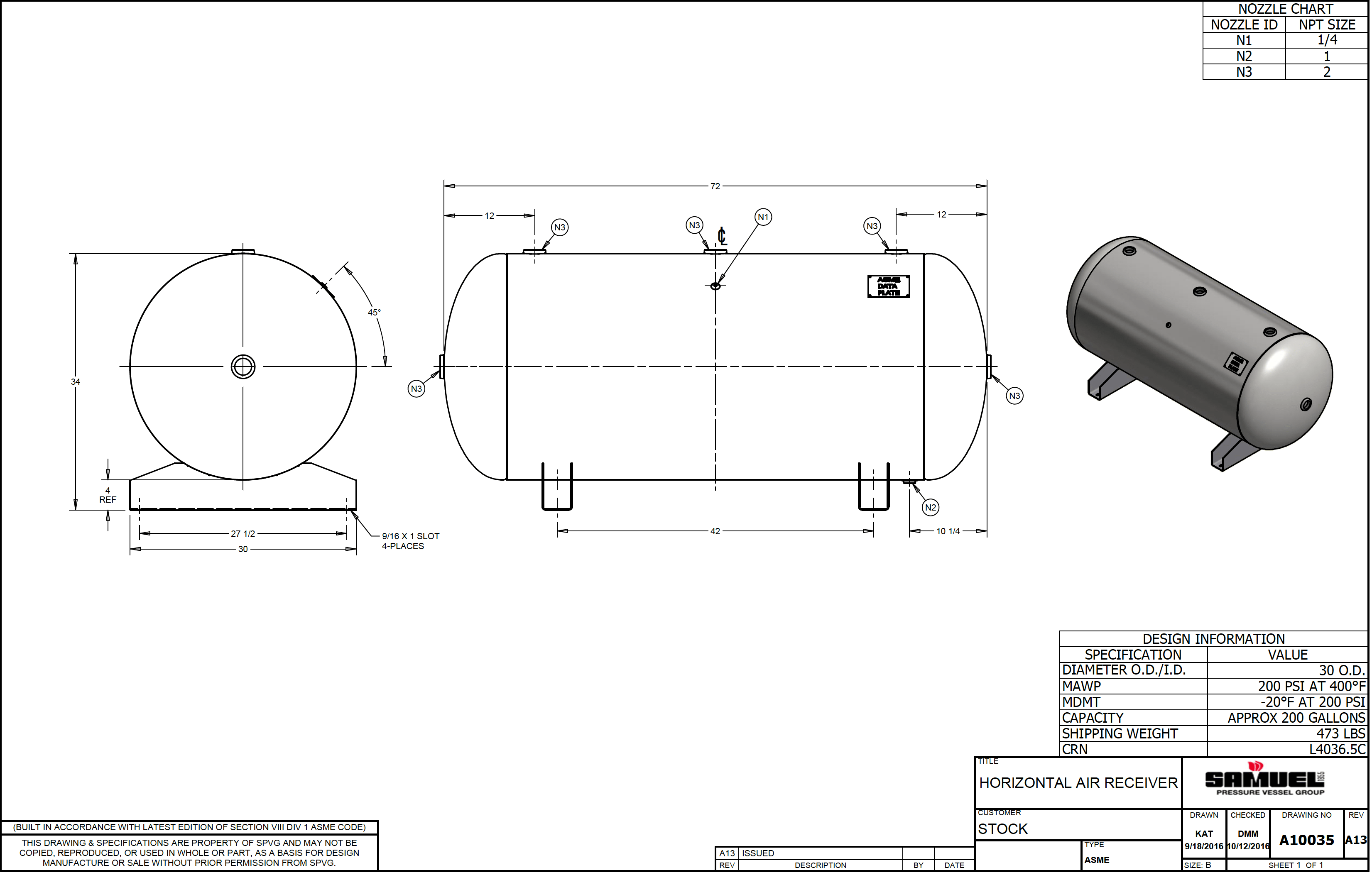 200 Gallon Horizontal Air Tank, 30" x 72" with Saddle Legs, 200 PSI, ASME | A10035