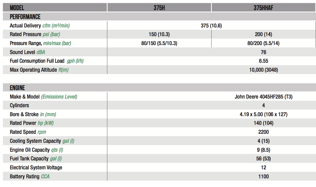 Sullair REMAN Certified 375H, 375 CFM, 150 PSI, Portable Diesel John Deere Engine Rotary Screw Compressor World Latin America | 02250217-510